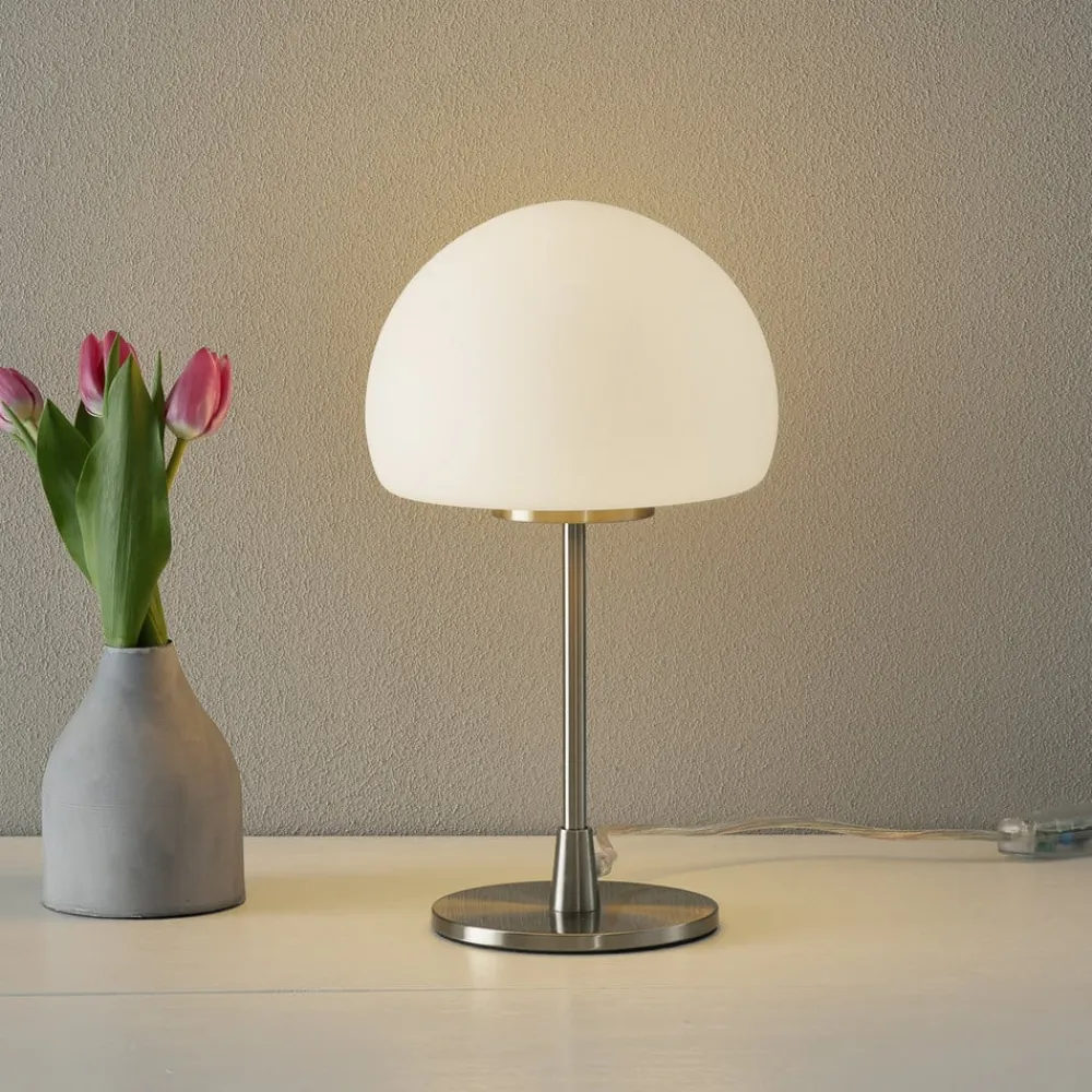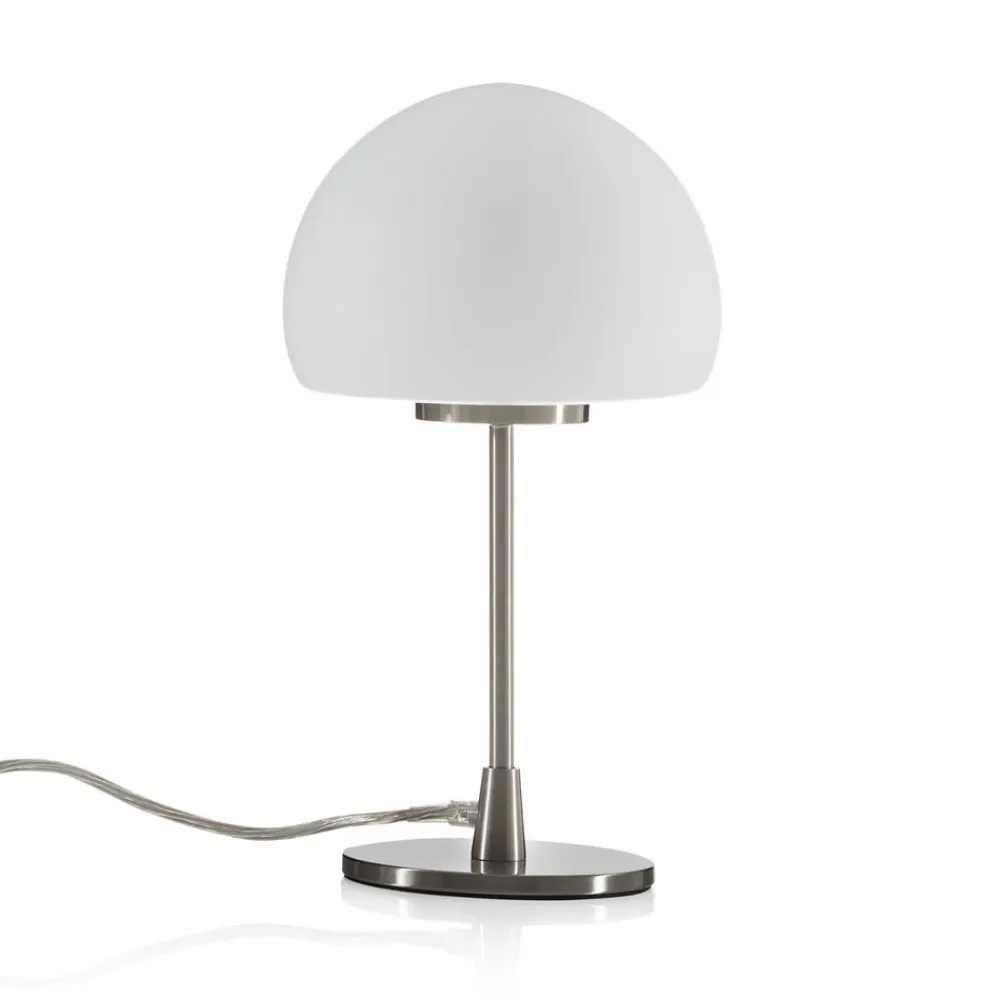 Gaia big kan næsten beskrives som en klassiker blandt bordlamper. Paraplyen holdes enkel og tidløs i form af en halvkugle. Lyset trænger igennem den opalfarvede glasskærm og skaber en hyggelig atmosfære. Den har en berøringsfunktion til praktisk tænding og slukning. Dette gør det velegnet til placering på et natbord, men kan også placeres på et vindueskarm som et alternativ. Deres krævende design harmonerer med enhver møblestil og ser høj kvalitet og stilfuld ud.