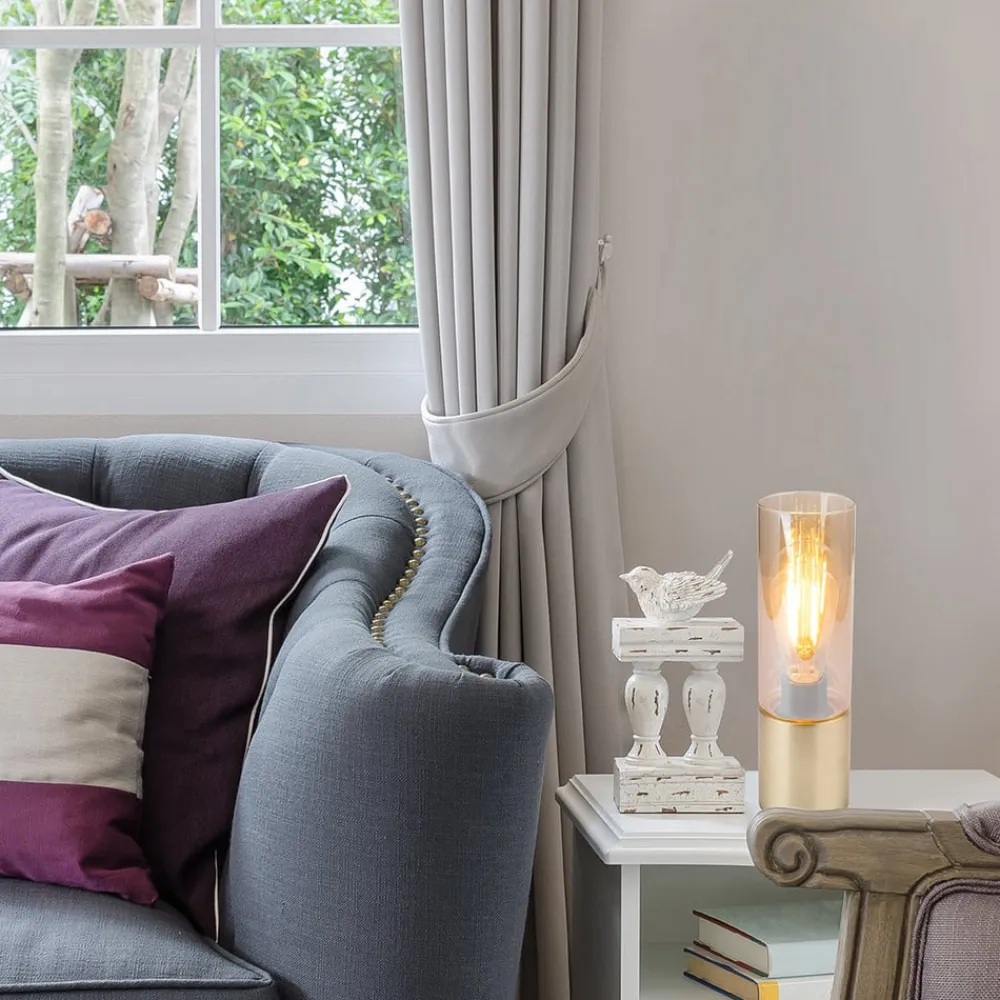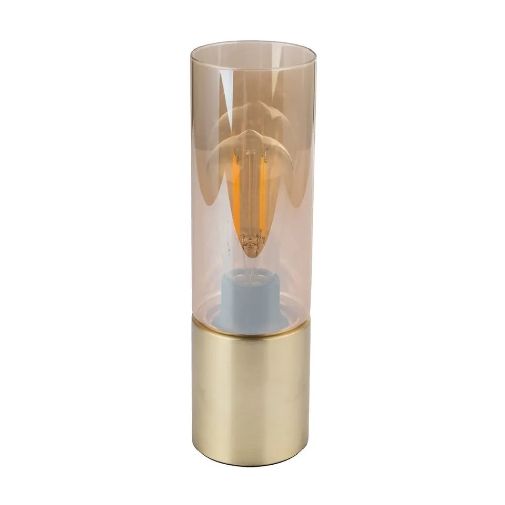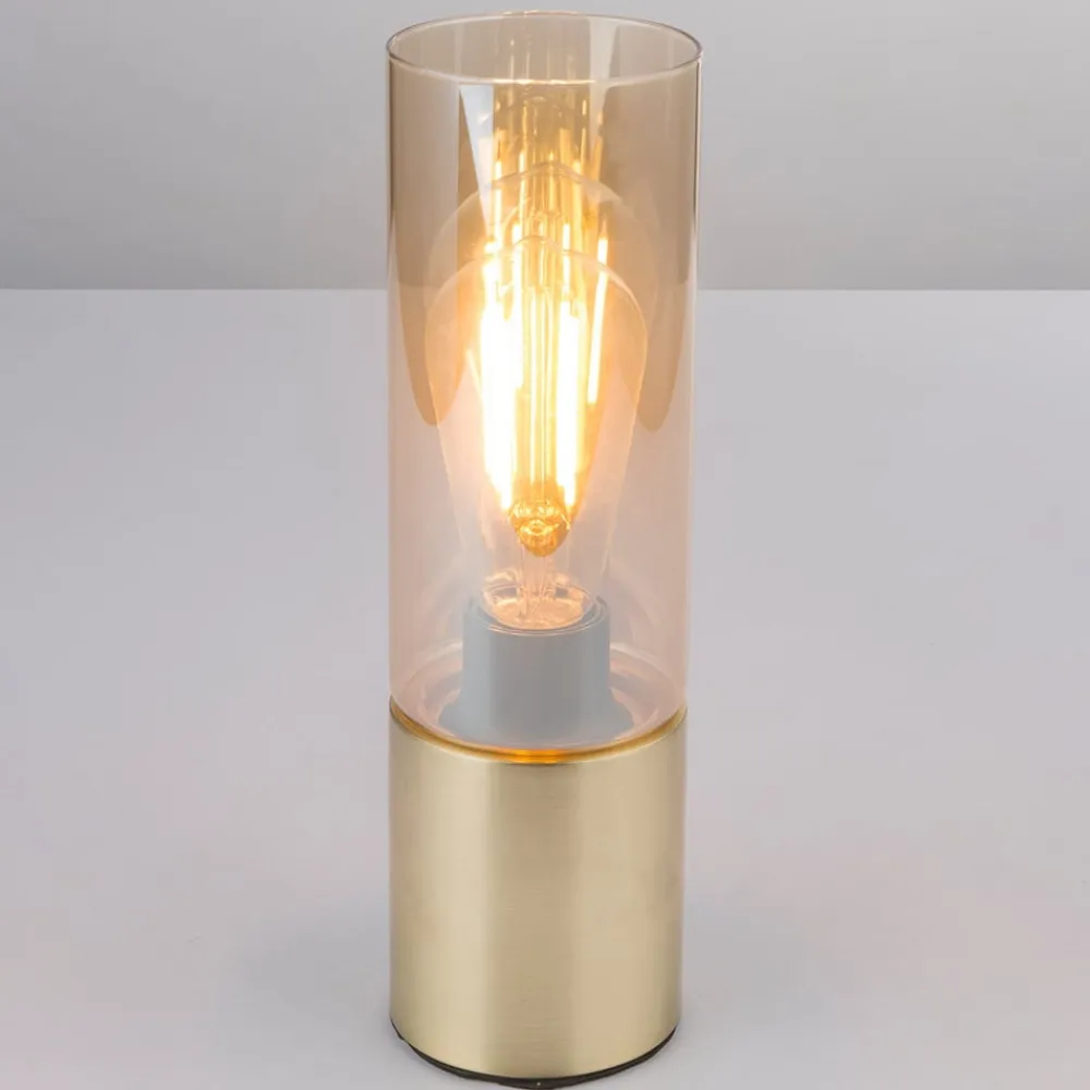 Den cylinderformede lampeskærm begejstrer med dens ravfarvede glas, der giver udsyn til den integrerede lyskilde. Man kan hurtigt tænde og slukke for lampen, ved hjælp af den praktiske touchkontakt. Denne bordlampe overrasker ikke mindst med dens matte messingtone, der sikrer et enkelt men dog stadig elegant design, der kan anvendes overalt.