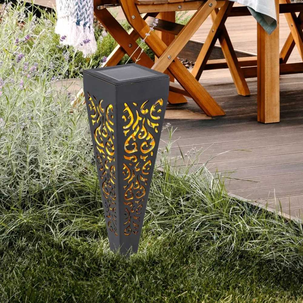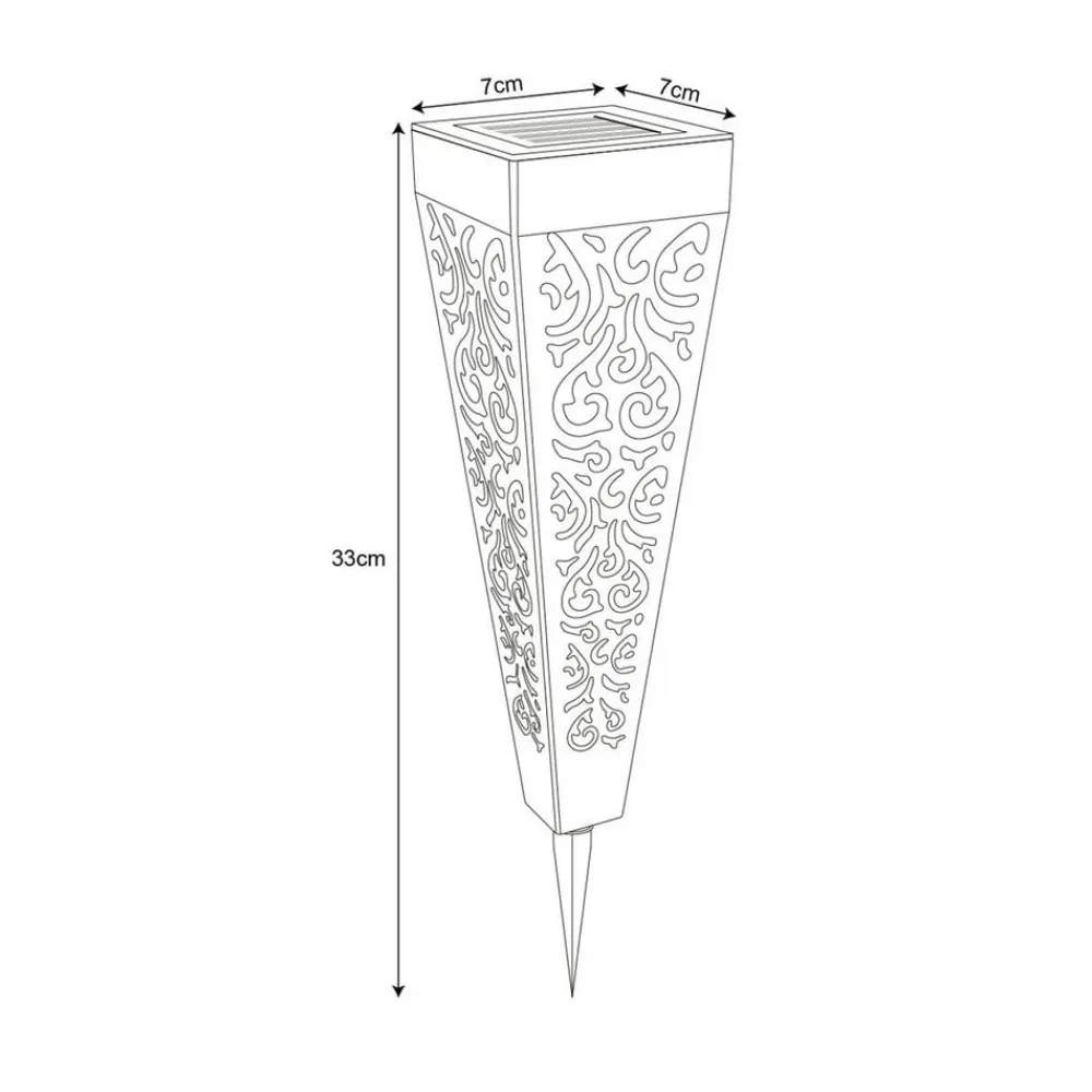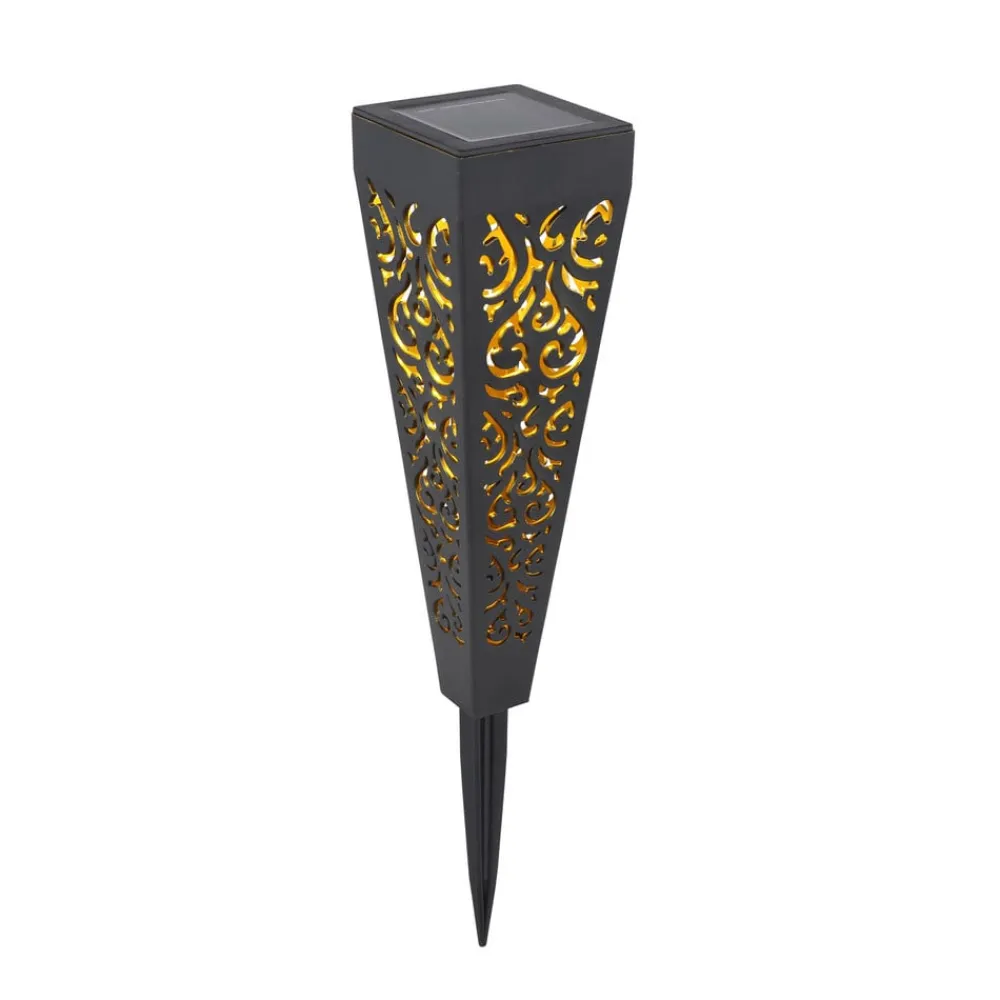 LED-lampe med jordspyd 33578-3 i sæt med 3 Denne solcellelampe af sort plast (kapslingsgrad IP44) i et sæt med 3 er ideel til enhver have. Den 33 cm høje solcellelampe kan nemt placeres i blød jord, f.eks. på engen, ved hjælp af jordspyddet. Solcellerne er placeret på den firkantede top (7×7 cm) og opsamler energi i seks til otte timer i løbet af dagen. Solcellelampen bliver smallere mod bunden, hvilket resulterer i, at den projicerer et elegant mønster på jorden.
