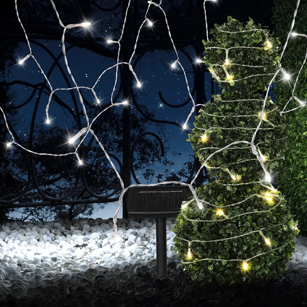Transparente Ece solcellelys til udendørs brug Ece solcellelys er ideelle til belysning af altaner, terrasser eller træer. Takket være IP 44-beskyttelsesgraden er den ideel til udendørs brug, da den er robust og beskyttet mod støv og vandsprøjt. Den scorer også højt med hensyn til energiforbrug takket være den moderne teknologi. Takket være solpanelet lyser den op med solenergi uden omkostninger – i op til 8 timer, når den er fuldt opladet. Længden fra solpanelet til den første lampe er 3 meter, så lyskæden kan bruges fleksibelt. Takket være det gennemsigtige kabel er Ece-lyskæden næsten usynlig, når den bruges til at dekorere planter og lignende.