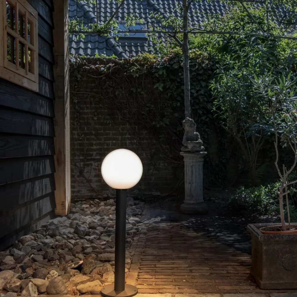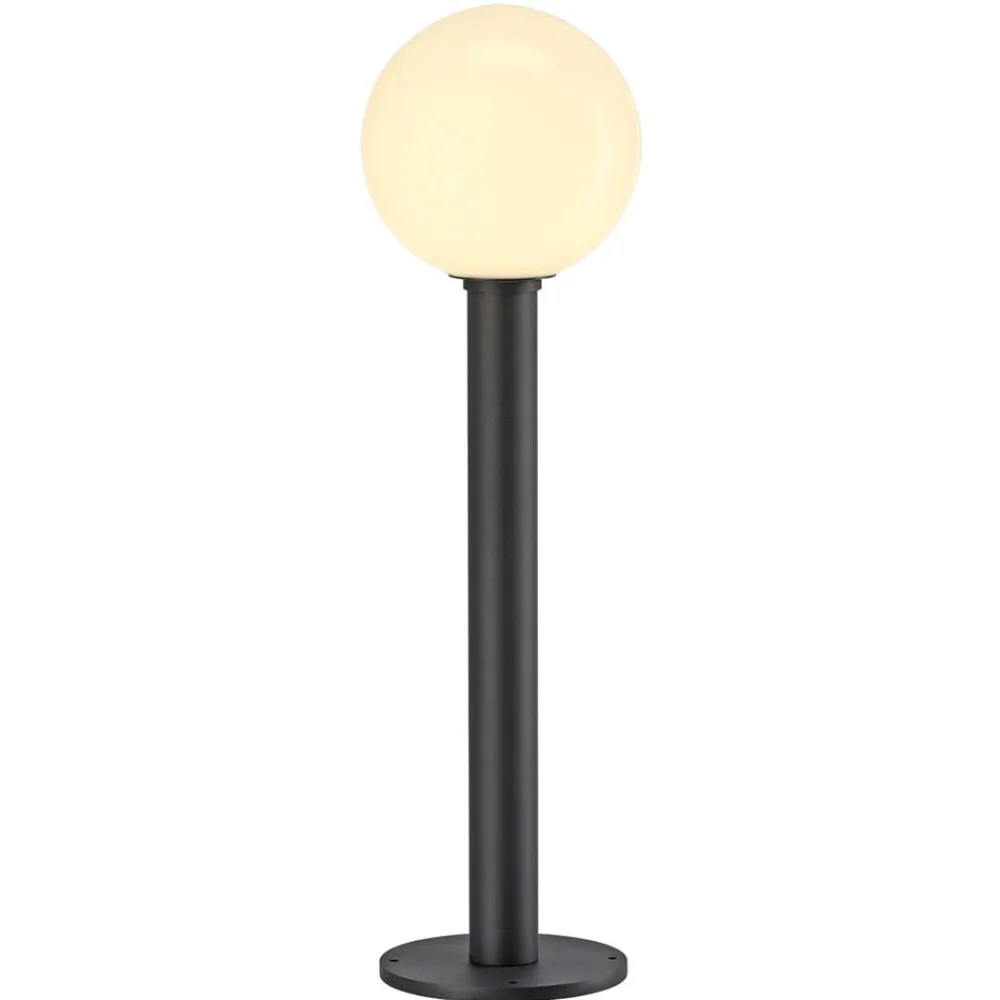 Gloo Pure stibelysning – sikker belysning af alle ejendommens stier Ejendomsbelysning er ikke kun til dekorative formål, men først og fremmest til sikkerhed. Gloo Pure-stibelysningen er ideel til markering af stier og andre områder om natten med et kugleformet armaturhus af matteret glas, der giver belysning hele vejen rundt. Farven på Gloo Pure-stibelysningen med den antracitlakerede aluminiumsramme passer til mange ejendomsdesigns.