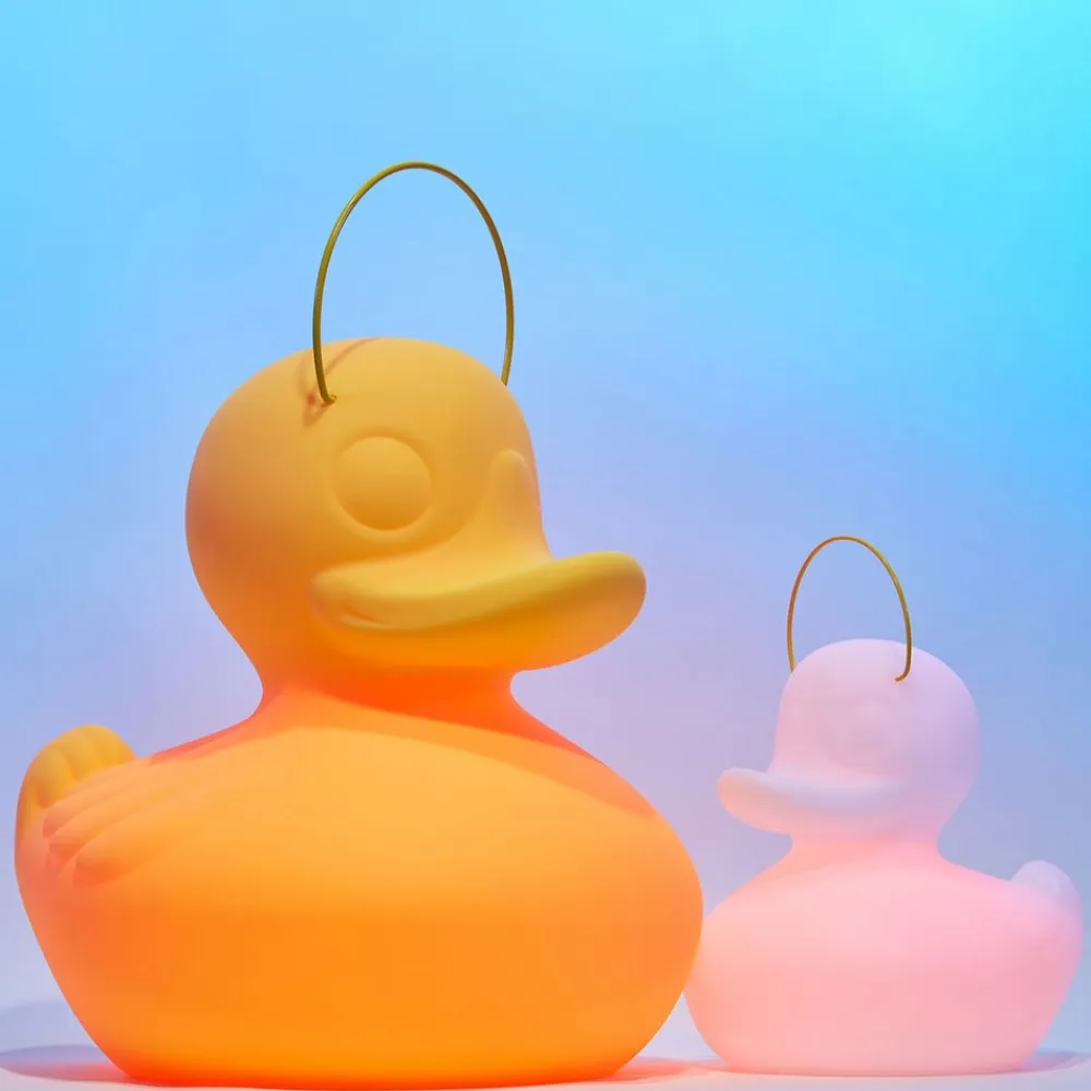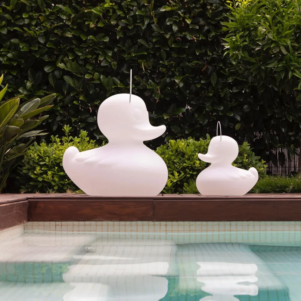 Svævende and med effektiv belysning – LED-designlampe DUCK-DUCK S Uanset om det er til private eller kommercielle udendørsområder, bringer den moderne DUCK-DUCK S dekorationslampe kreativt design til enhver have. Formen glæder både voksne og børn, da armaturet minder om den klassiske badeand, som er et must i ethvert badeværelse. DUCK-DUCK S er nu anden til den udendørs pool: Den flyder, er slag- og brudsikker samt UV-resistent og kan derfor uden tøven bruges udendørs. De integrerede LED’er styres af en infrarød fjernbetjening, der følger med i leveringen, og som ud over at vælge lysfarve kan skifte til en tretrins lysstyrke. DUCK-DUCK S kan også tændes og slukkes via kontakten i bunden af selve dekorationslyset. Et integreret genopladeligt batteri giver en belysningstid på flere timer, som kan variere afhængigt af lysstyrkeniveauet. En induktionsladestation, som er inkluderet i leveringsomfanget, sikrer praktisk opladning. DUCK-DUCK S LED-designlampen har også et praktisk bærehåndtag i form af et robust, aftageligt metalbeslag på andens hoved. Designet af DUCK-DUCK S LED-dekorationslyset kommer fra den engelske designer Marke Newton, som har designet dette produkt for Goodnight Light.- Batteriets opladningstid ca. 6 timer- Lysets varighed ca. 7-10 timer