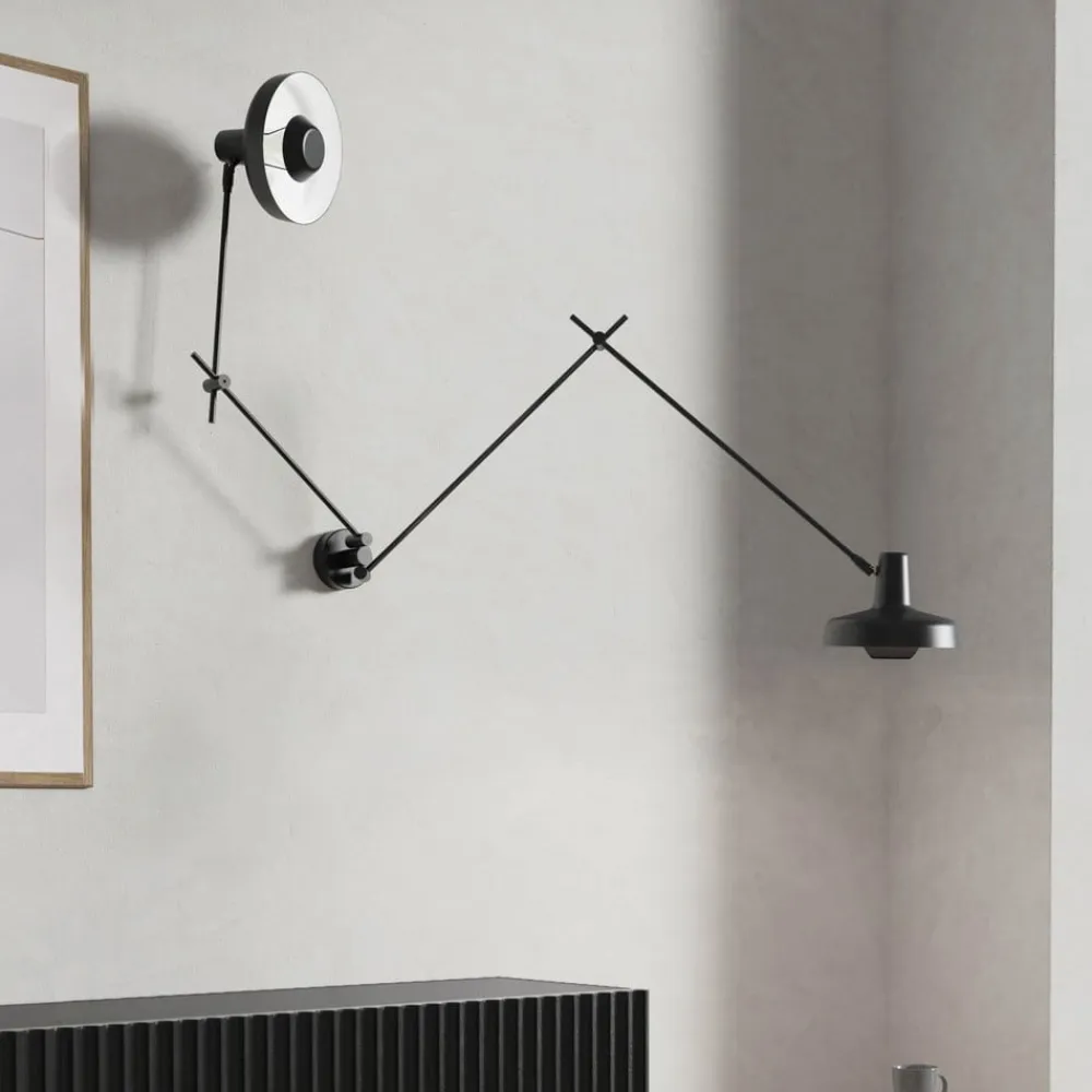 Tidløs Arigato-væglampe med to justerbare skærme Designet af Arigato-væglampen, der er designet og fremstillet af det kroatiske firma GRUPA, kan kombineres på en absolut alsidig måde. De to slanke stålarme er hver opdelt i to sektioner, der hver holder en rund aluminiumsskærm. Der er plads til en lampe bag hver skærm, så direkte lys afskærmes, og der opnås optimal visuel komfort. Den hvidlakerede inderside sikrer også en effektiv lysfordeling. Arigato-væglampen gør ikke kun en god figur i stuen, men imponerer også i arbejdsværelset takket være sin fleksibilitet. Armaturets sektioner er forbundet med samlinger, så f.eks. den ene skærm kan orienteres mod væggen til indirekte belysning og den anden til bordbelysning – Udstyret med stik og afbryder – Også velegnet til fast tilslutning – Made in Europe