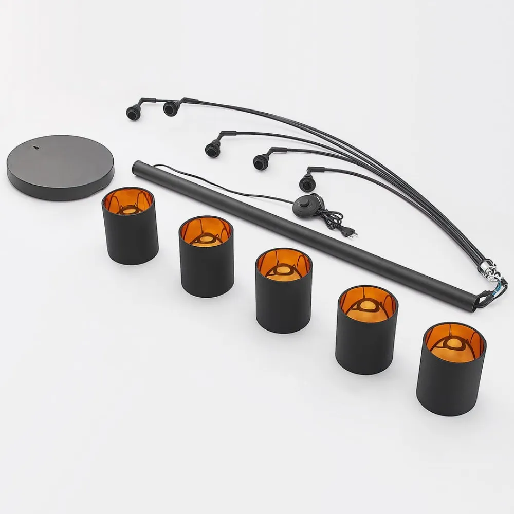 Abiram gulvlampe med 5 lyskilder til stemningsfuld belysning i moderne opholdsrum Abiram gulvlampe kommer i en klassisk sort farve og imponerer med sit ekspansive design. Den har en rund, stabil base og en stålramme samt let buede lampearme, der kan drejes efter behov. På den måde kan Abiram-armaturet garantere en god belysning i rummet, da de fem lyskilder kan placeres præcis der, hvor der er mest brug for lyset. De cylindriske lampeskærme er beklædt med sort tekstil på ydersiden og overrasker med et gyldent indre, der giver varme lysaccenter.