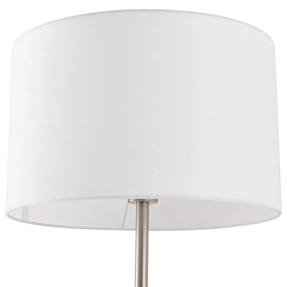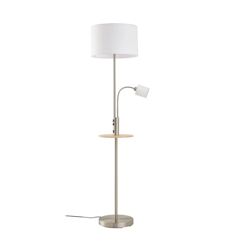 Nikkelfarvet gulvlampe Aovan med USB-opladestation og aflægningsflade