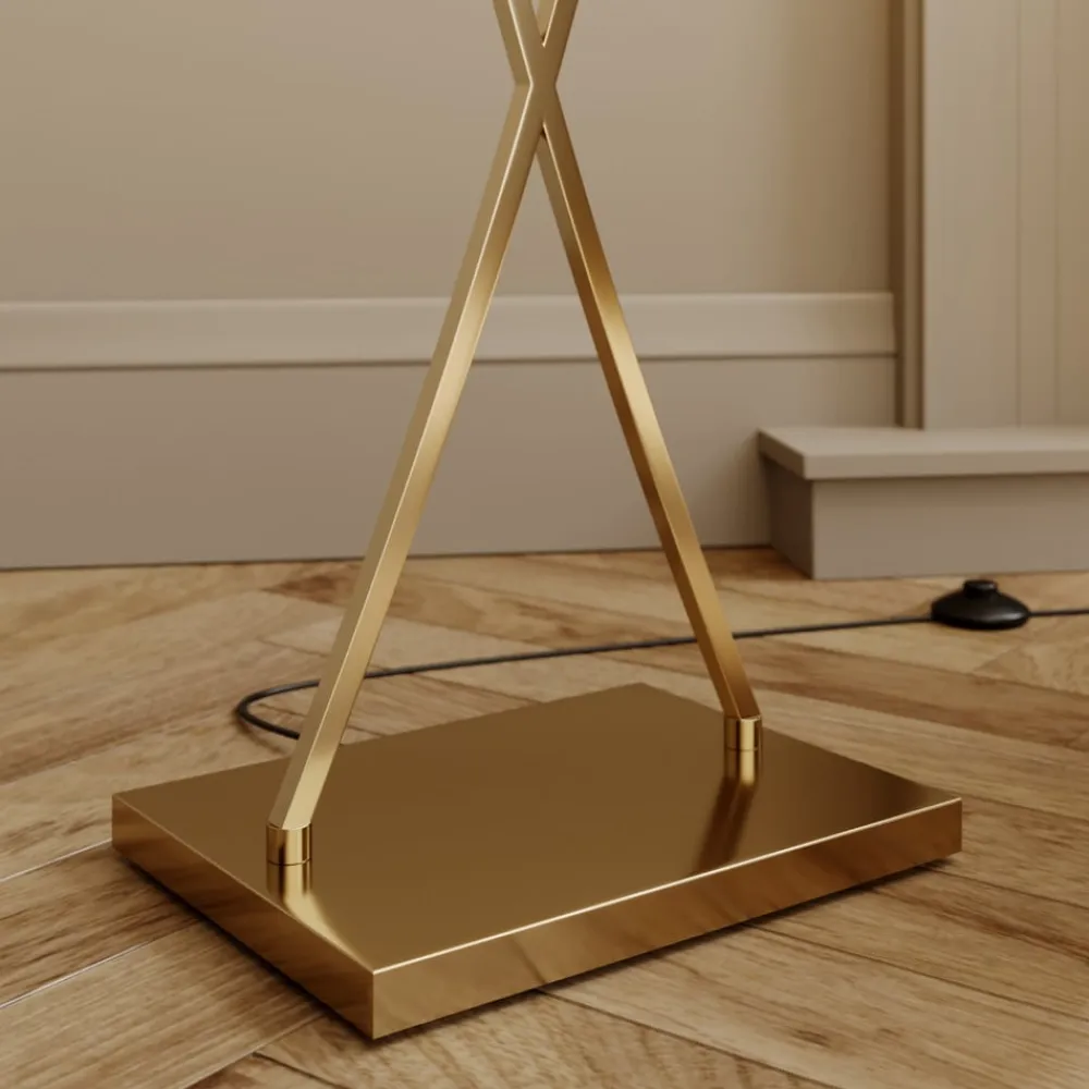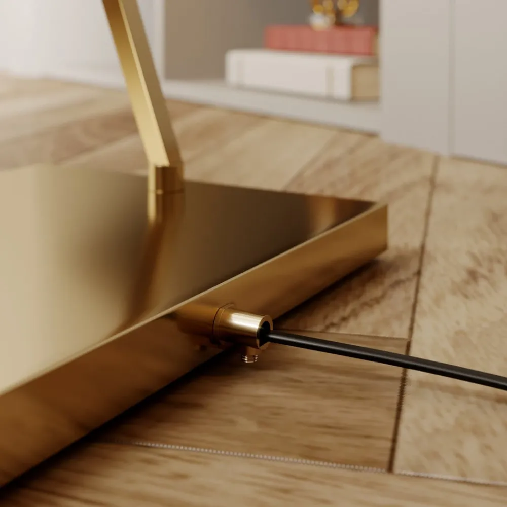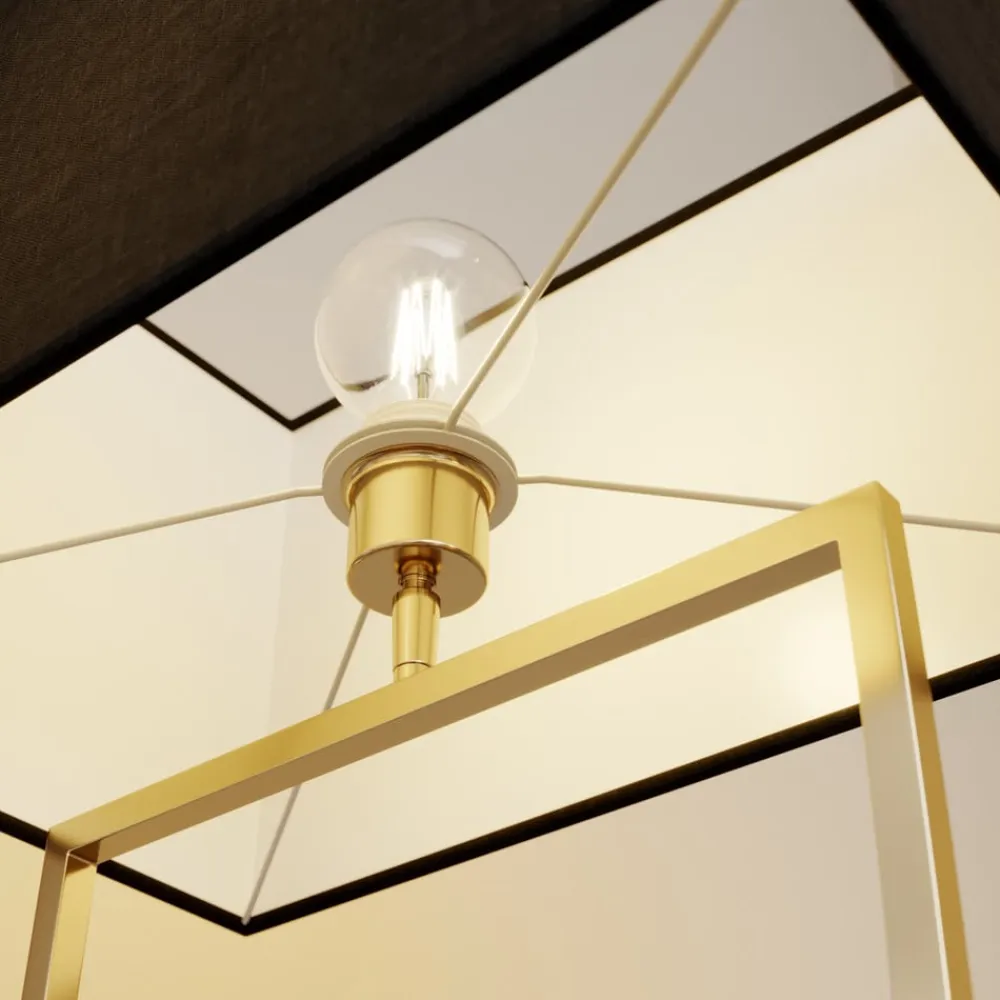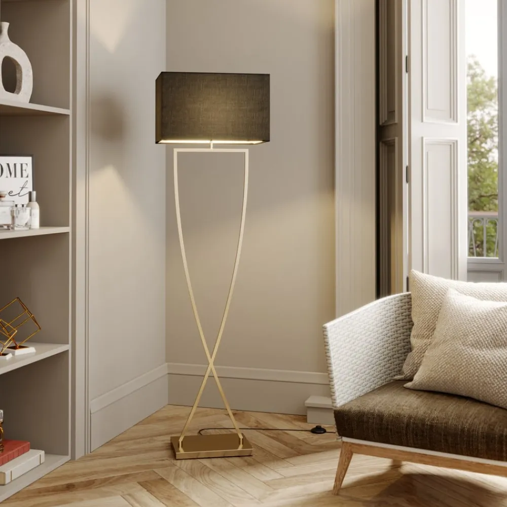 Evaine – gulvlampe med rektangulær skærm Dekorativ indretningsgenstand og perfekt indirekte lyskilde – gulvlampen Evaine er begge dele. Med sit messingfarvede stel, som er harmonisk og elegant buet, og sin rektangulære lampeskærm i sort er den enkel, men har alligevel det helt særlige. Når lyset tændes, udfolder det sin fulde effekt og skaber en behagelig, indirekte lysstemning. Den tændes og slukkes nemt ved hjælp af en fodkontakt. Evaine er en gulvlampe, der kan bruges i moderne opholdsrum som f.eks. en stue eller et soveværelse, hvor den skaber en hyggelig atmosfære.