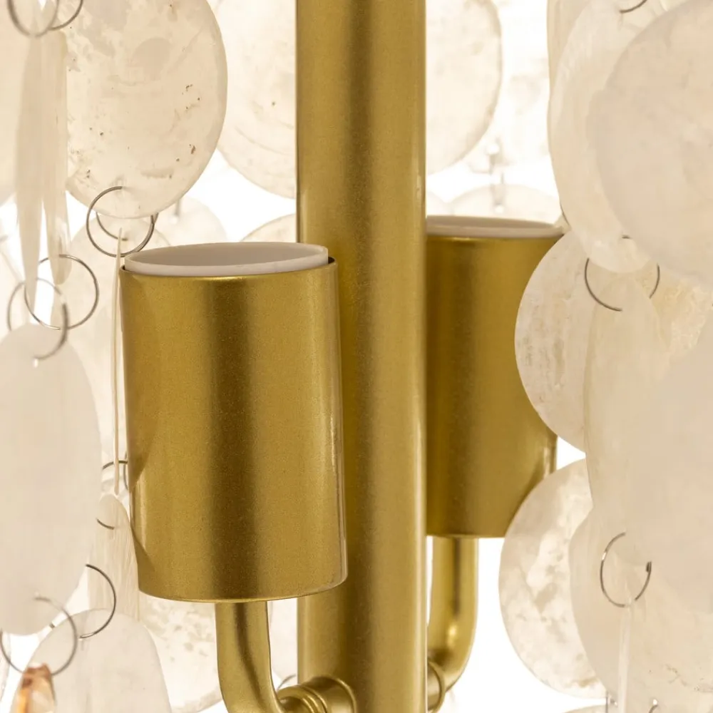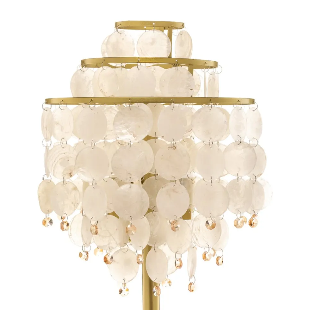 Gulvlampen Ruben med perlemorsskiver kombinerer ædle materialer og stilfuldt design. Den er fremstillet af højkvalitetsmetal og dekoreret med skinnende perlemorsskiver, der giver et luksuriøst touch til enhver stue eller spisestue. Den gyldne farve harmonerer perfekt med perlemorsskivernes naturlige nuancer og skaber en varm og indbydende atmosfære.