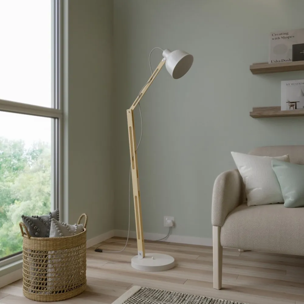 Gulvlampen Skansen forener industrielt design med en elegant kombination af træ og metal. Denne stilfulde lampe passer perfekt ind i stuen og spisestuen og sætter moderne accenter. Det lyse trælook i kombination med den hvide finish skaber et harmonisk og samtidig markant udtryk, der giver ethvert rum et særligt præg.
