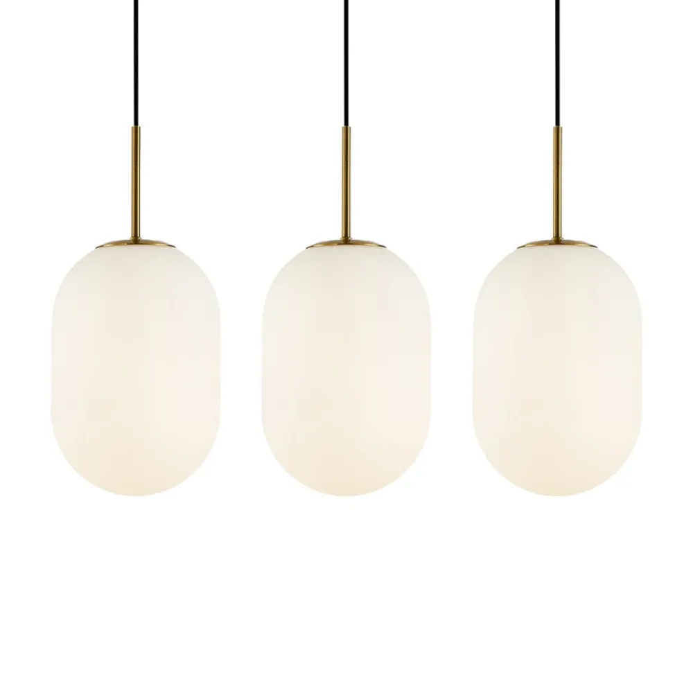 Hængelampen Alias kombinerer moderne design med materialer af høj kvalitet som glas og metal for at skabe et imponerende belysningselement. Kombinationen af opal hvidt glas og guldfarvet metal giver ethvert rum et elegant touch. Med sine 3 lyskilder og aflange form er den ideel til brug i stuer, spisestuer, soveværelser og køkkener.
