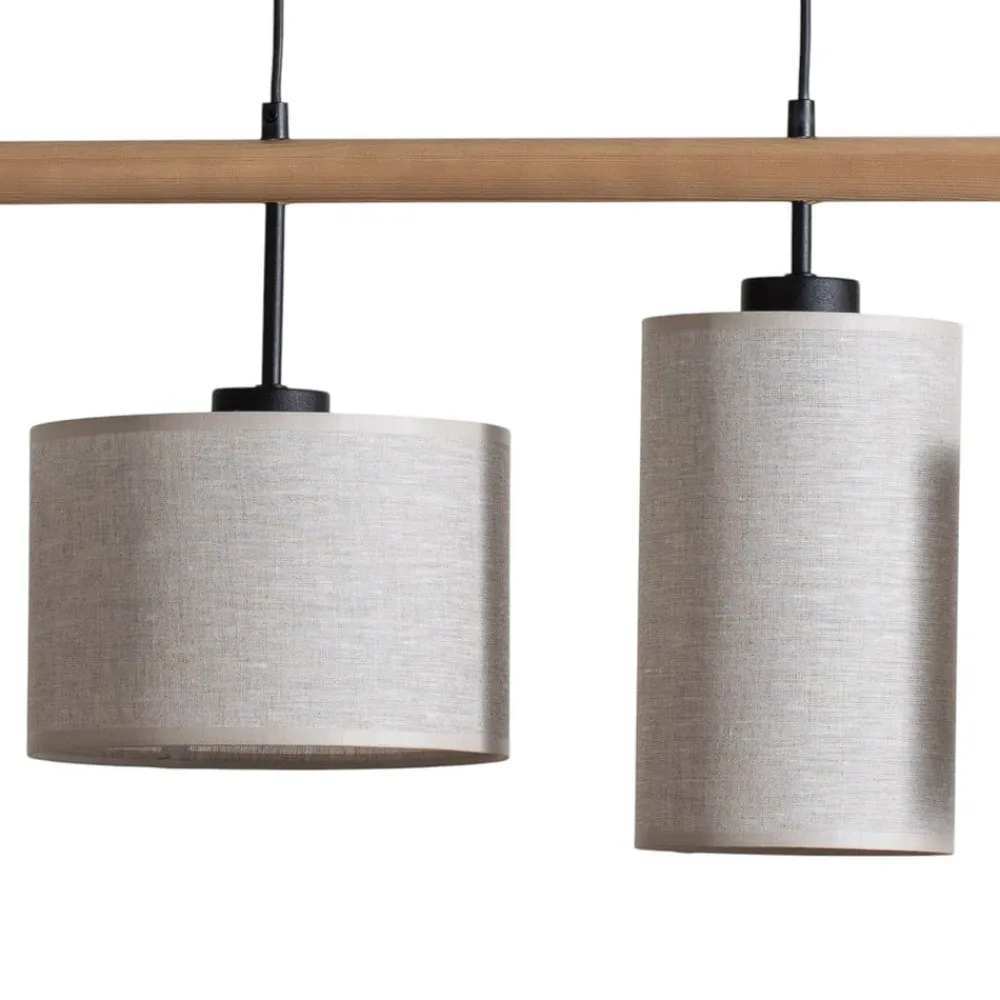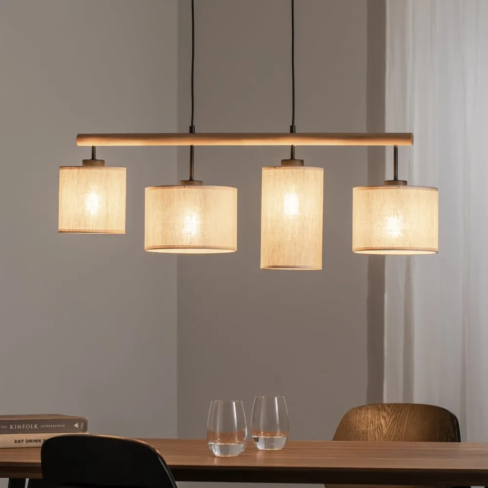 Hængelampen Deva Nature forener skandinavisk enkelhed med varmen fra naturlige materialer. Denne lampe med 4 lyskilder er fremstillet af bomuld, træ og stål og passer harmonisk ind i stuen og spisestuen. Kombinationen af lyse træfarver og diskrete farver som beige og sort skaber en indbydende atmosfære, der udstråler både hygge og elegance.