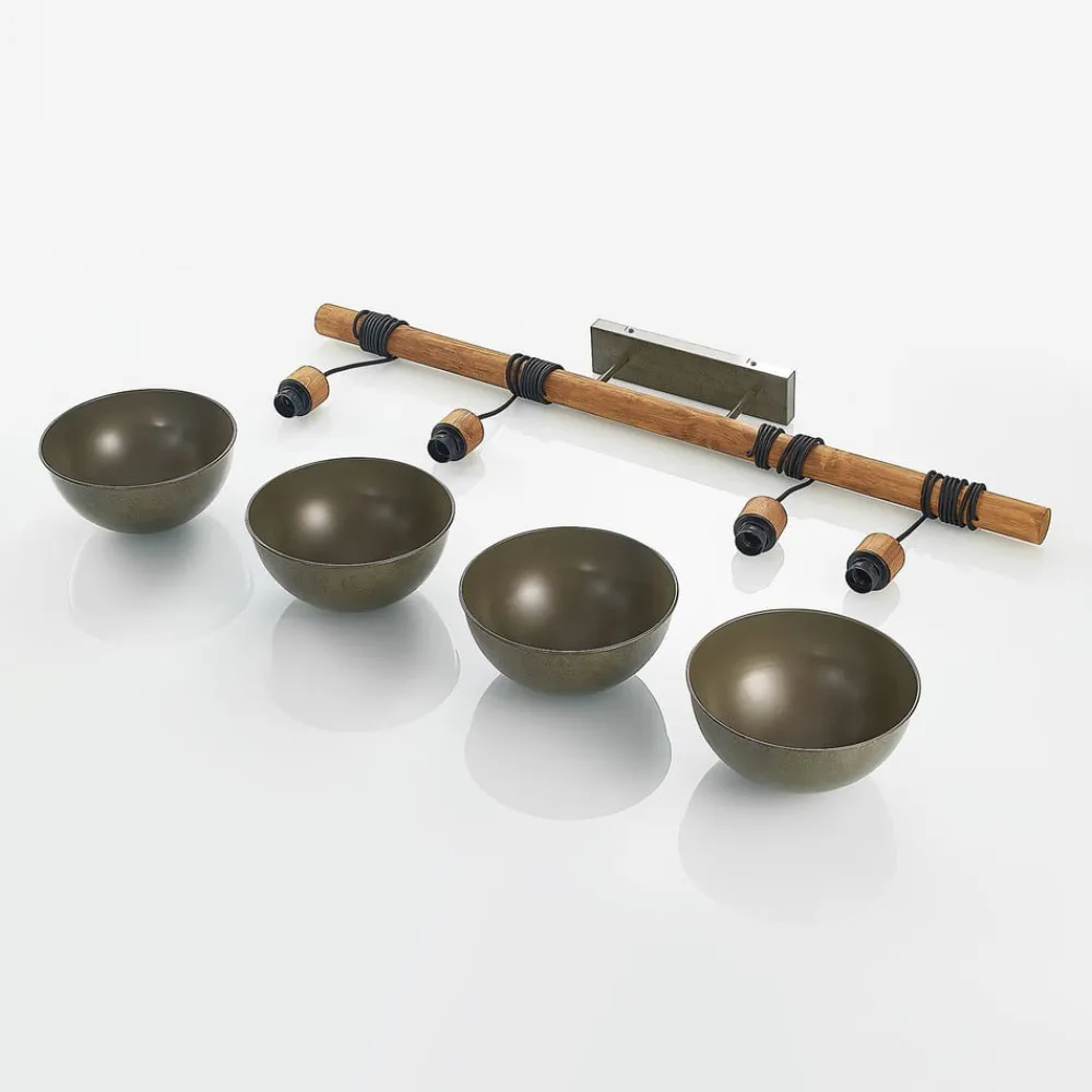 4 lyskilder Durbis med håndfarvede metalskærme Durbis er en 4 lyskilder hængelampe, som består af en kombination af håndfarvede metalskærme i mørkegrå og et langt træelement. De brede lampeskærme er udstyret med E27-fatninger, der kan monteres med alle typer pærer. De udsender kun lys nedad i en bred vinkel, så lyset kan bruges til at oplyse et bord eller en disk perfekt. De enkelte lampeskærme kan ophænges fleksibelt ved at vikle kablet rundt om det lange træelement mere eller mindre ofte.