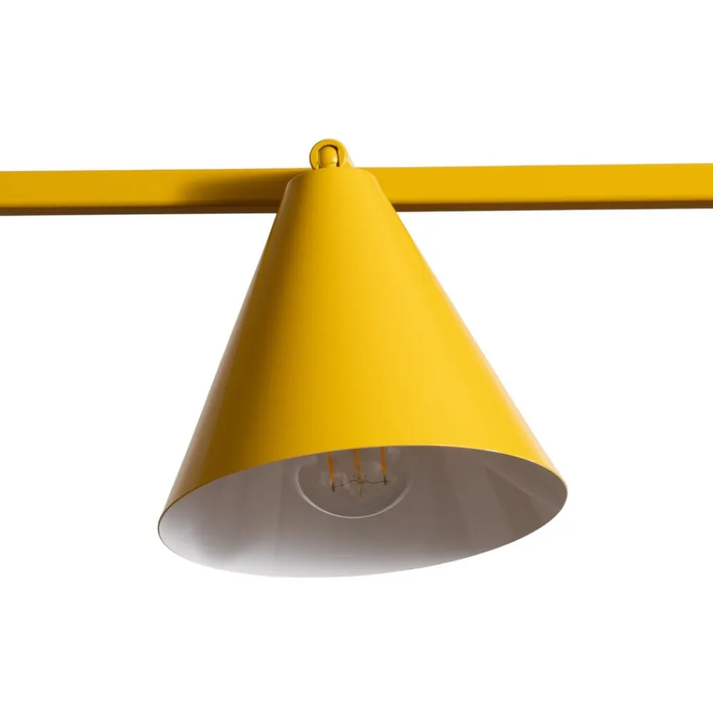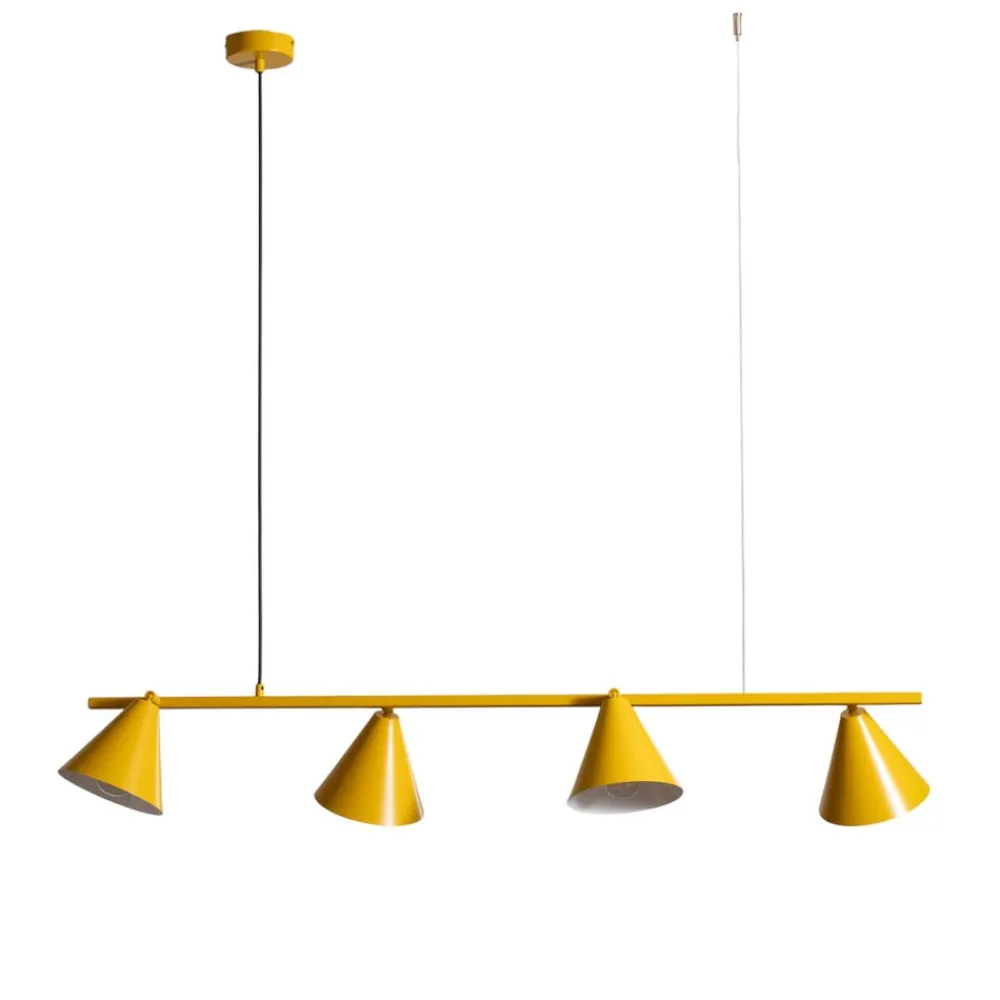 Hængelampe Form 4 i sennepsgul metal kombinerer moderne design med funktionel belysning. Med sine fire flammer og den klassiske kegleform sætter den stilfulde accenter i ethvert rum. Uanset om det er i spisestuen, køkkenet eller stuen, skaber denne lampe en indbydende atmosfære og kan tilpasses fleksibelt til lysbehovet takket være den eksterne dæmpbarhed.