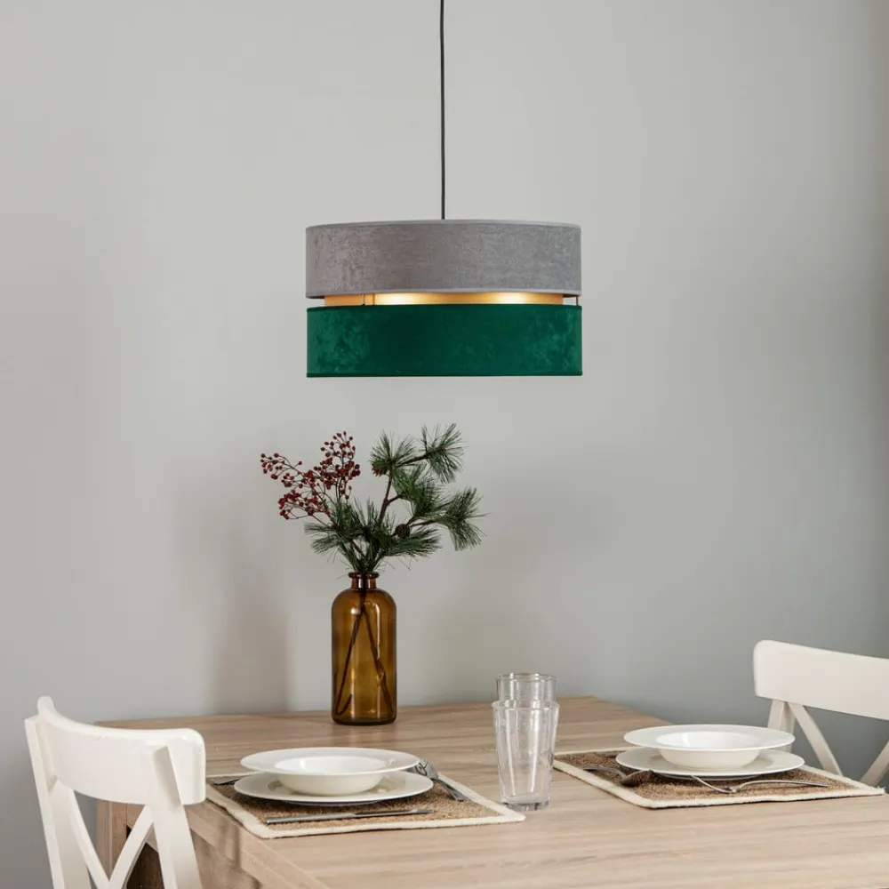 Hængelampen Golden Duo forener stilfuld elegance med et unikt farvespil i grå, mørkegrøn og guld. Den er fremstillet af fløjl i høj kvalitet og giver ethvert rum en luksuriøs atmosfære. Uanset om den hænger i stuen, soveværelset eller spisestuen, sætter denne lampe accenter og skaber en harmonisk stemning. Muligheden for at dæmpe lyset via en ekstern dæmper gør det muligt at tilpasse lysintensiteten individuelt og dermed skabe den ønskede stemning.