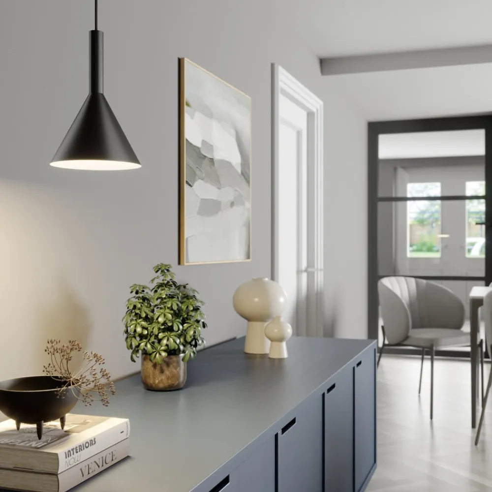 Tadej passer især godt til moderne, puristiske boligstilarter. Pendellampen består grundlæggende af en tragtformet lampeskærm, der har et langstrakt, smalt element øverst og munder ud i et konstant udvidende skærmelement nederst. På denne måde sikres det, at lyset udelukkende rettes nedad, da metal som bekendt er et uigennemsigtigt materiale, og lyset fra E27-pæren kun slipper ud, hvor skærmen er åben, dvs. i bunden. Pæren kan vælges efter ønske og kan også fås med effektiv LED-teknologi eller en ekstra varm lysfarve. Hængelampen med den sorte yderside kan bruges som solitair til almindelig rumbelysning, men kan også arrangeres stilfuldt i en række med flere eksemplarer af sin ART over et bord eller en disk.