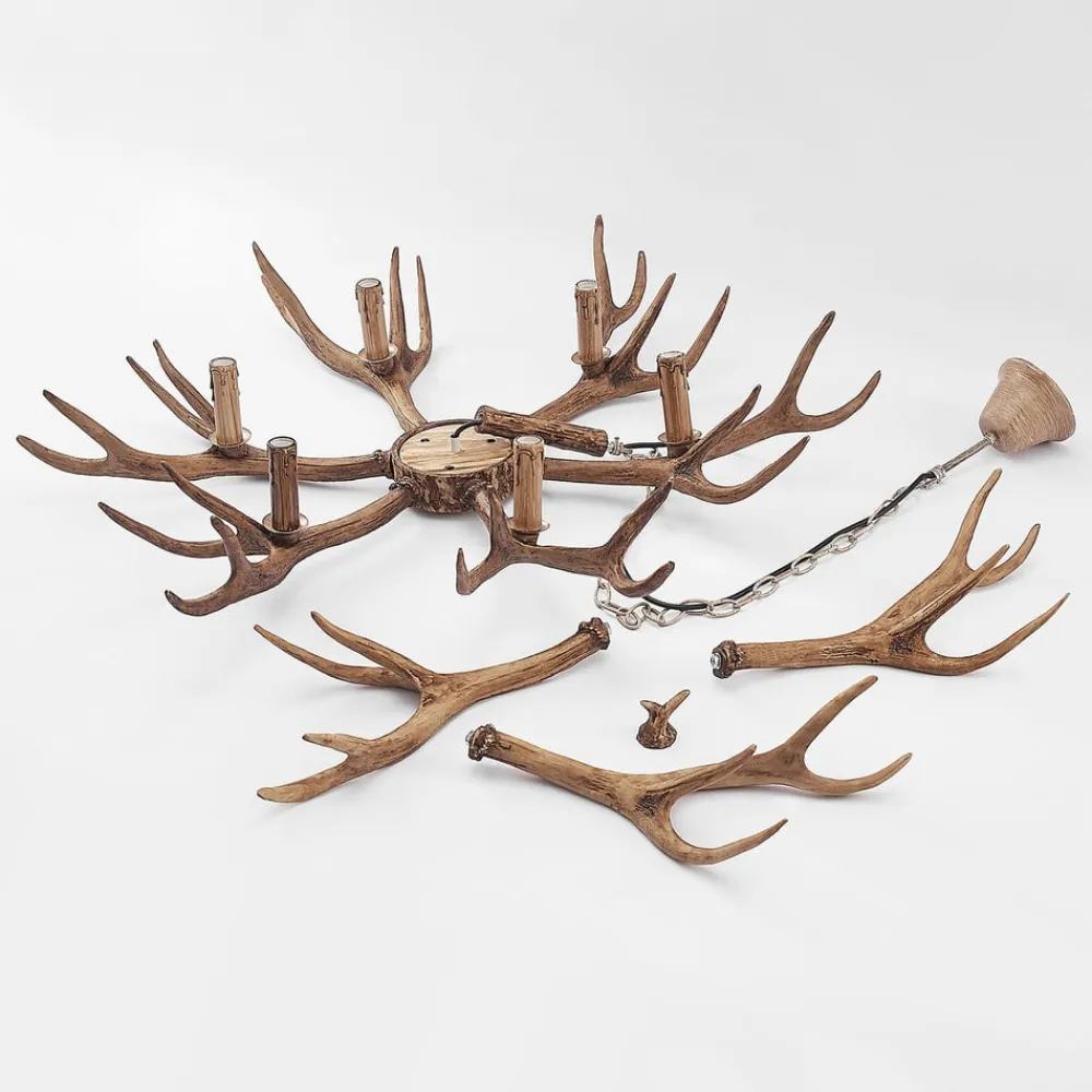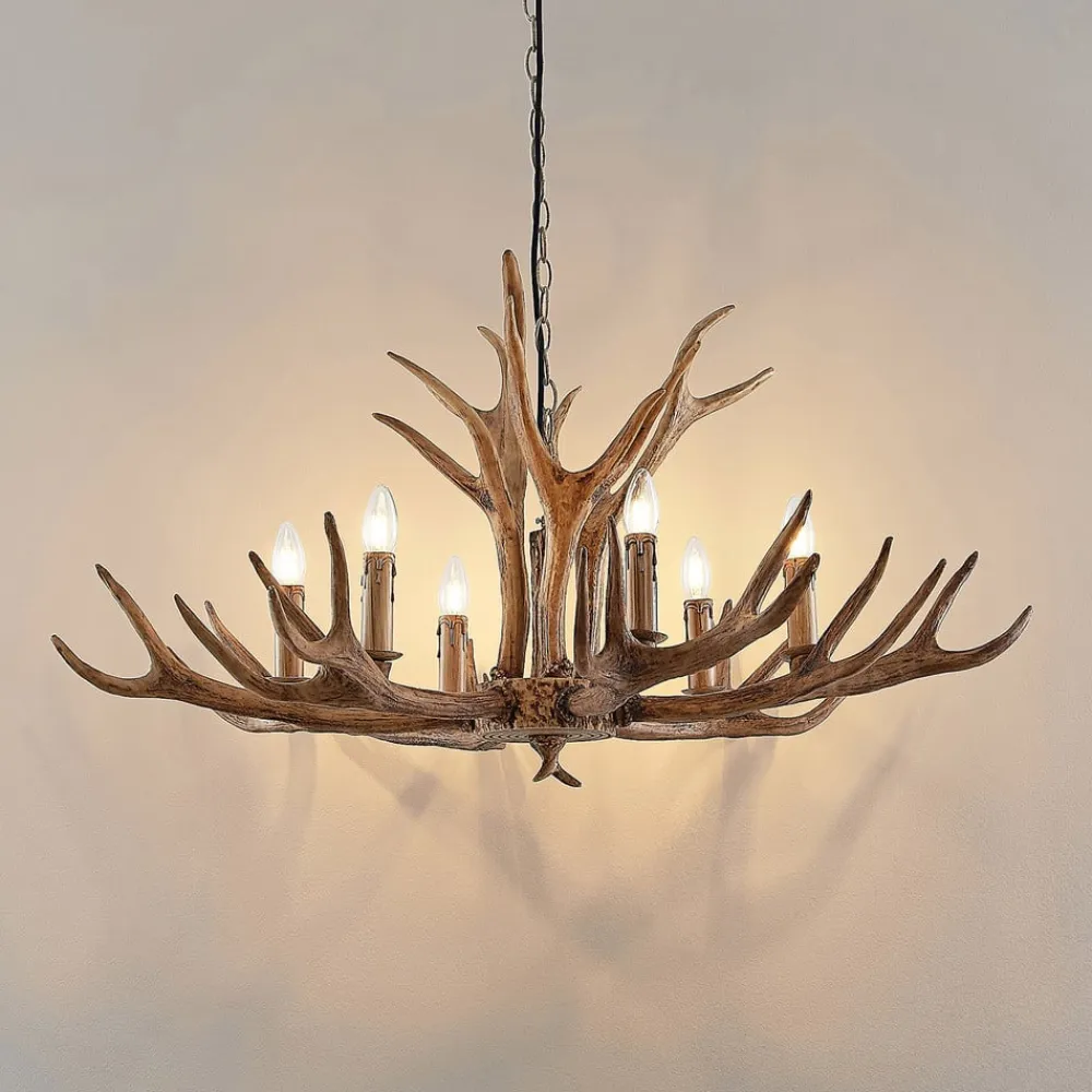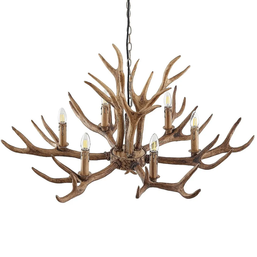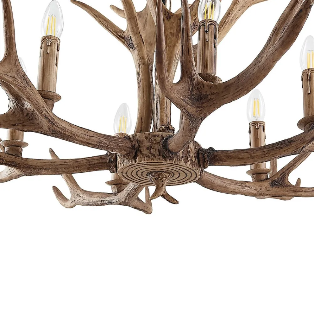 Stor Tejask lysekrone i form af gevirer Tejask imponerer med sit rustikke design og er en lysekrone med kædeophæng, der ikke kun kan bruges i private opholds- og spisestuer, men også pynter på enhver rustik restaurant med sit markante og iøjnefaldende look, som uden tvivl minder om gevirer og skov og eng. Det gør Tejask lysekronen til en lyskilde, der kan henføres til hyttestilen og forstår at skabe en særlig hygge i rumbelysningen. Den rustikke brune nuance på plastgeviret ser meget autentisk ud, og hængelampen kan udstyres med i alt seks kertepærer, som også kan have en ekstra varm lysfarve, som det nogle gange er tilfældet med LED-filamentpærer. Så er hyggen i rummet fuldendt, og man kan læne sig tilbage og slappe af i lyset fra Tejask hængelampen og føle sig godt tilpas.