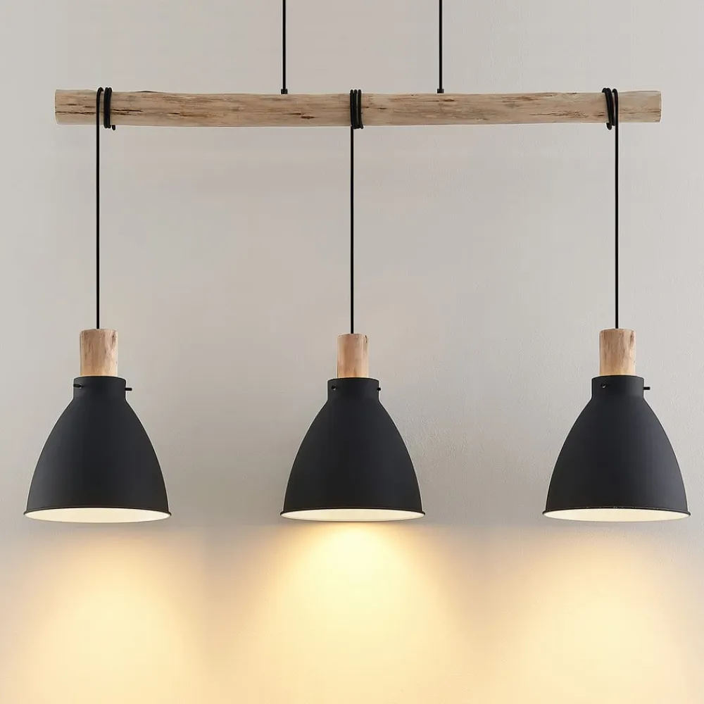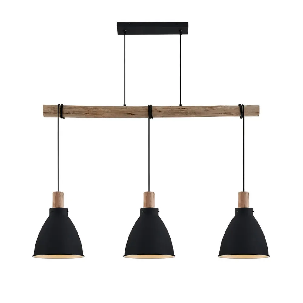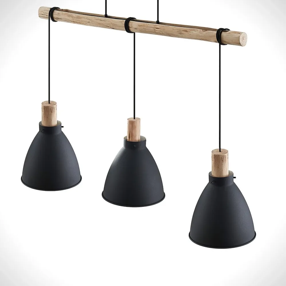 Trebale-pendlen i metal og eukalyptustræ Den 3 lyskilder store Trebale-pendel er ekstremt dekorativ og fleksibel takket være kombinationen af matsortlakeret metal og detaljer i eukalyptustræ på den ene side og ophænget på den anden, som kan varieres i højden ved at vikle skærmene med deres kabler rundt om træstangen og dermed gøre det muligt at ophænge dem i forskellige højder.