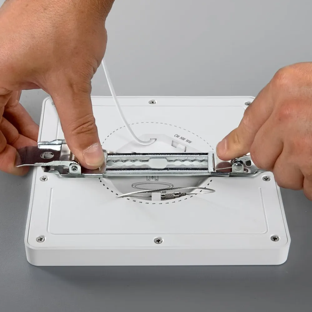 Selesto LED-panelet er firkantet og imponerer med sit højkvalitetshus af hvid aluminium. Den lysafgivende overflade, som udgør den største del af armaturet, udsender lyset fra de installerede LED’er jævnt over et stort område. Lysfarven kan justeres efter ønske mellem varm hvid (800 lumen), universal hvid (840 lumen) og dagslys (860 lumen) via en indbygget kontakt på bagsiden før installationen. Desuden kan Selestos lysintensitet varieres ved hjælp af lysdæmpere med fase tændt og fase slukket.