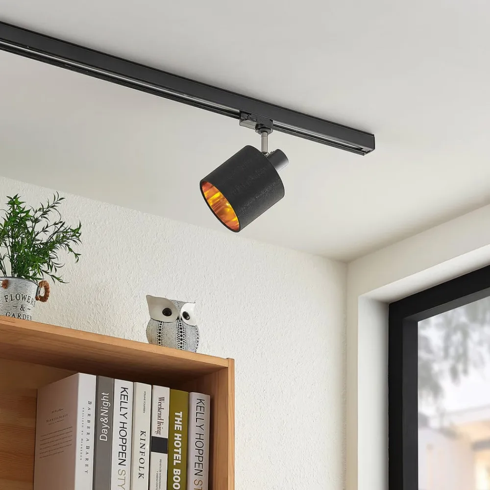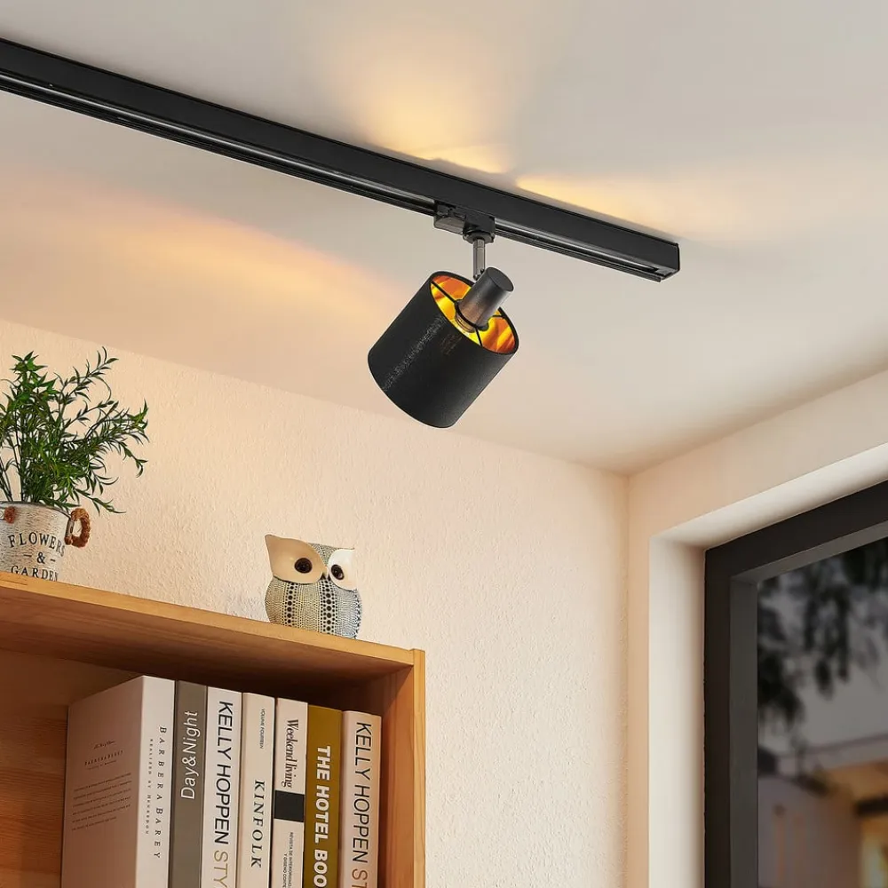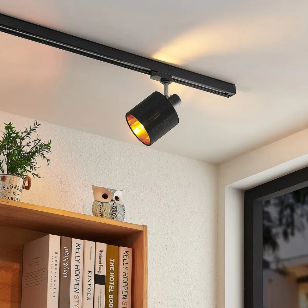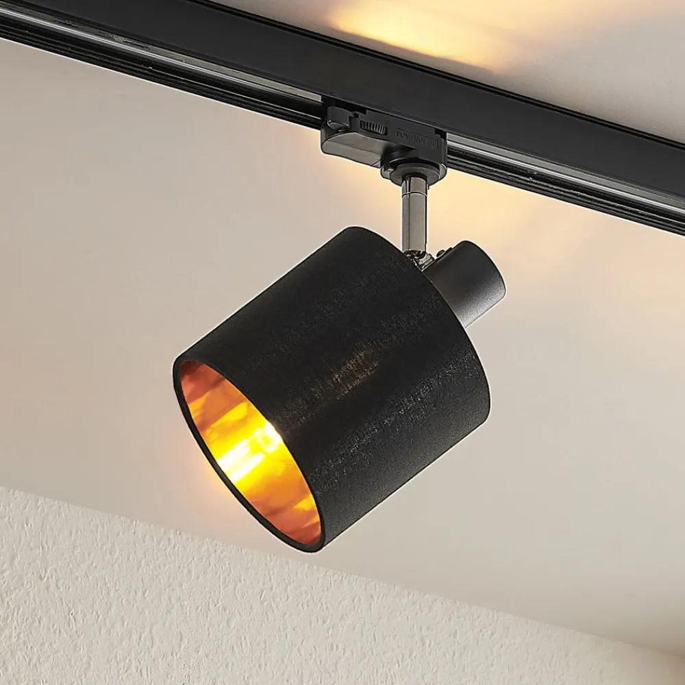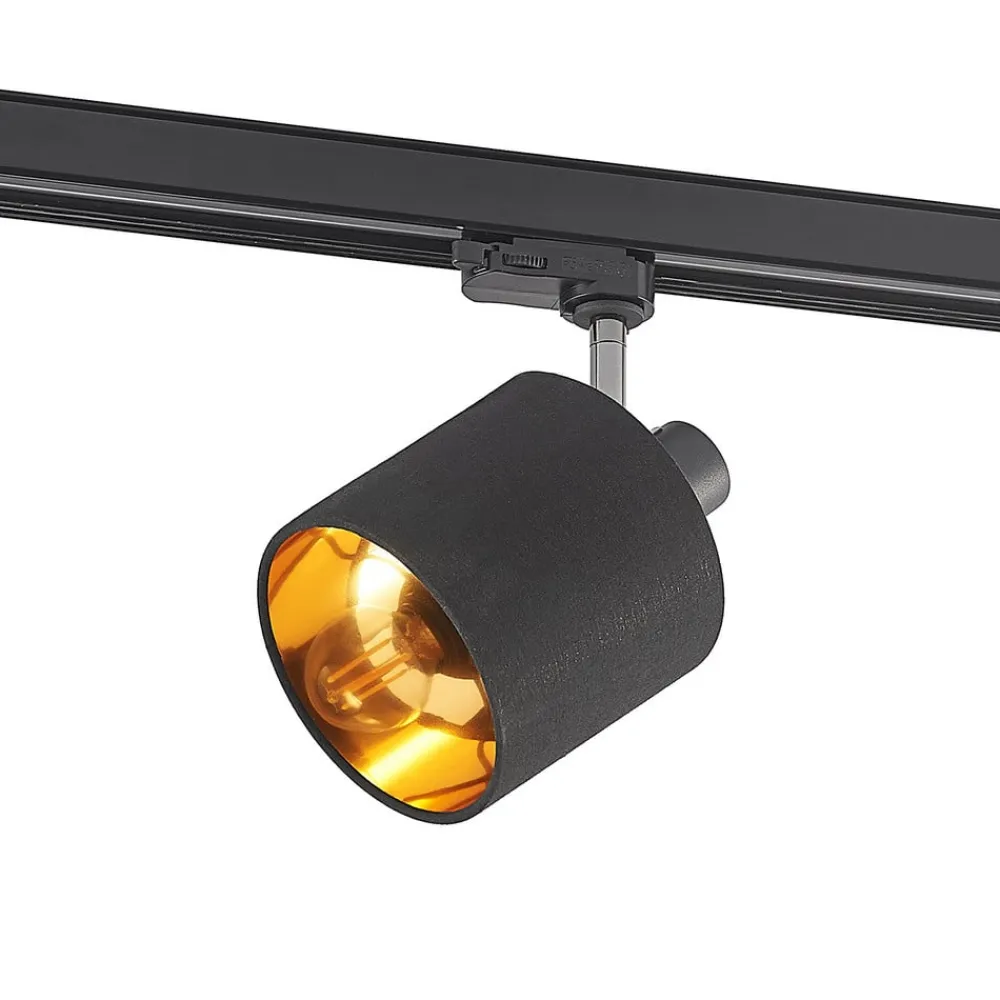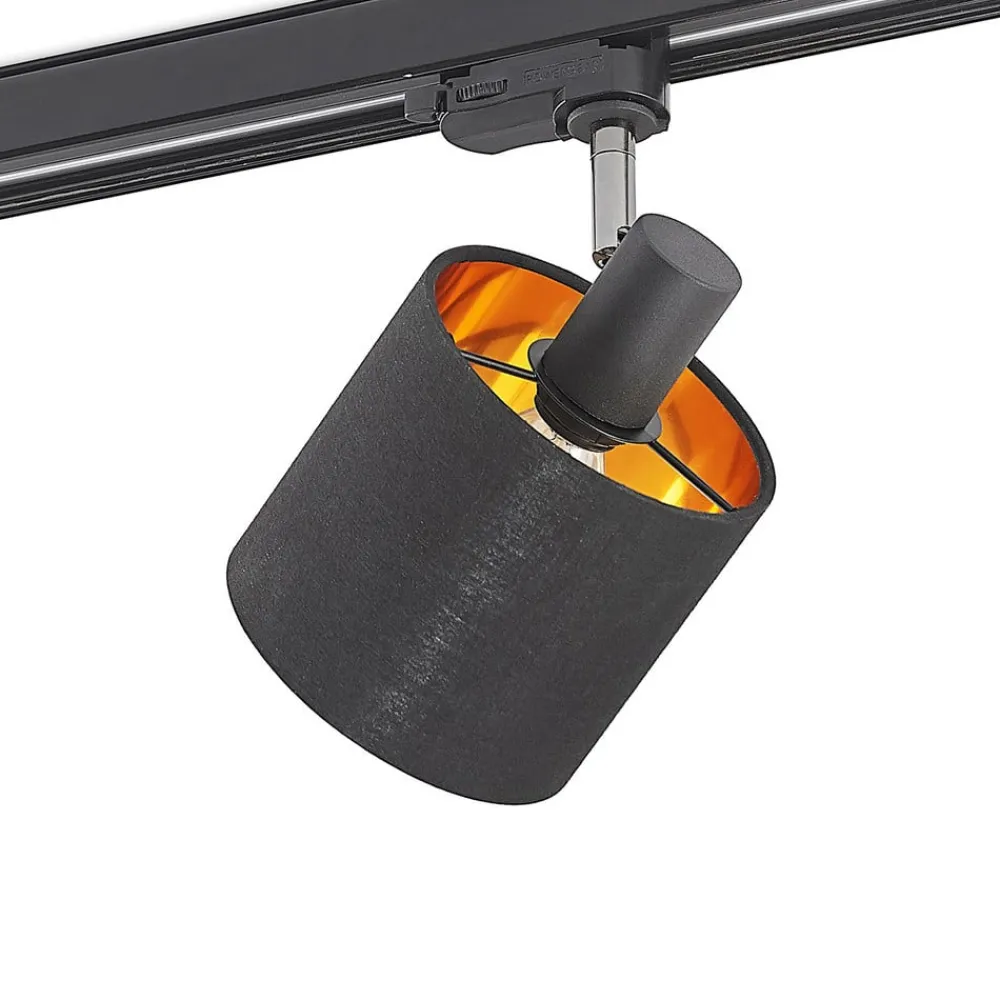 Heleni spot i en attraktiv farvekontrast af guld og sort til et skinnesystem Heleni er en pålidelig og moderigtig løsning, når det gælder belysning af boligarealer. Spottet kan nemt integreres i et skinnesystem med 3 faser og kombineres med andre lamper i serien. Den cylindriske lampeskærm er lavet af tekstil, og ydervæggene er sorte. Indersiden af skærmen er en slående guldfarve. Heleni spot kan også udstyres med passende pærer, som giver en blændfri belysning takket være det uigennemsigtige tekstil.