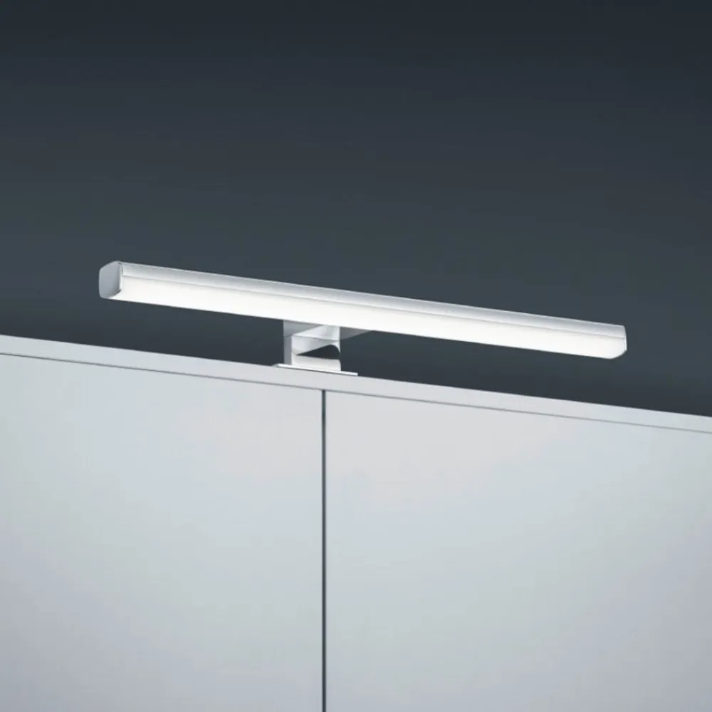 LED-spejl og væglampe Gaia i skinnende krom med fjernbetjening til nem justering af lysets temperatur og lysstyrke.
