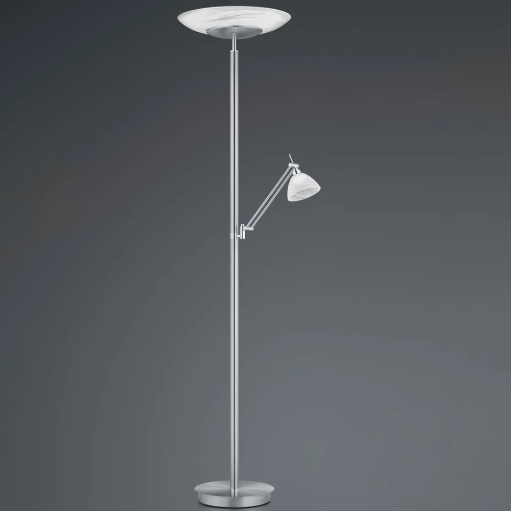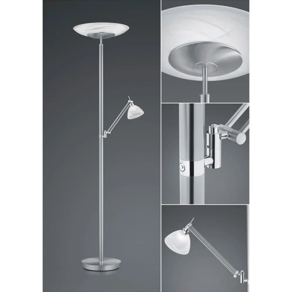 LED-gulvlampe Findus med projektørlys, læselys og integreret dæmpningsfunktion Findus er en gulvlampe, der overbeviser med sit klassiske og enkle design og passer til næsten enhver boligstil. Den lige metalramme med en rund base ender i et rundt floodlight-element, hvorfra der skinner et behageligt lys. Med sit varme og indirekte lys skaber LED-loftvaskeren en atmosfære af hygge og komfort. Den ekstra påmonterede læsearm i mellemste rammehøjde kan bevæges fleksibelt og muliggør dermed et målrettet lys, der kan bruges til læsning for at skåne øjnene under læsning. Begge lyskilder er udstyret med LED’er og kan bruges sammen eller uafhængigt af hinanden. Ved hjælp af en integreret lysdæmper kan lysstyrken ændres trinløst og meget nemt for at tilpasse den til den pågældende situation.