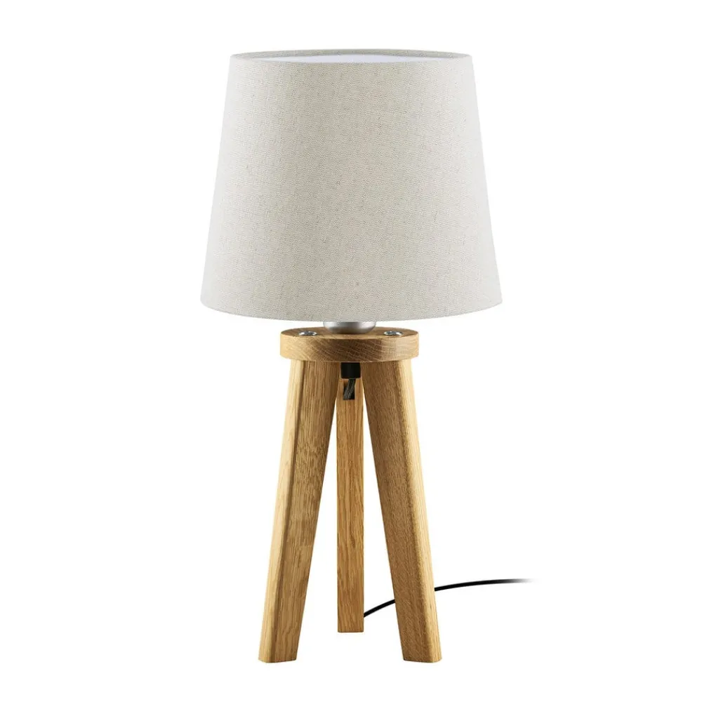 Elli trebenet bordlampe med træstel og stofskærmTimløst design, håndværk og sans for detaljer går hånd i hånd i Elli-bordlampen. Rammen består af tre træben, hvoraf det ene er udstyret med en kanal til forsyningskablet. Fatningen i kappen af mat børstet nikkel ligger i en tidløs tekstilskærm, der er udformet som en lodret åben keglestump og giver bordlampen et særligt hjemligt præg.- Bæredygtigt indkøbt træ fra FSC-certificerede leverandører – Fremstillet i Tyskland
