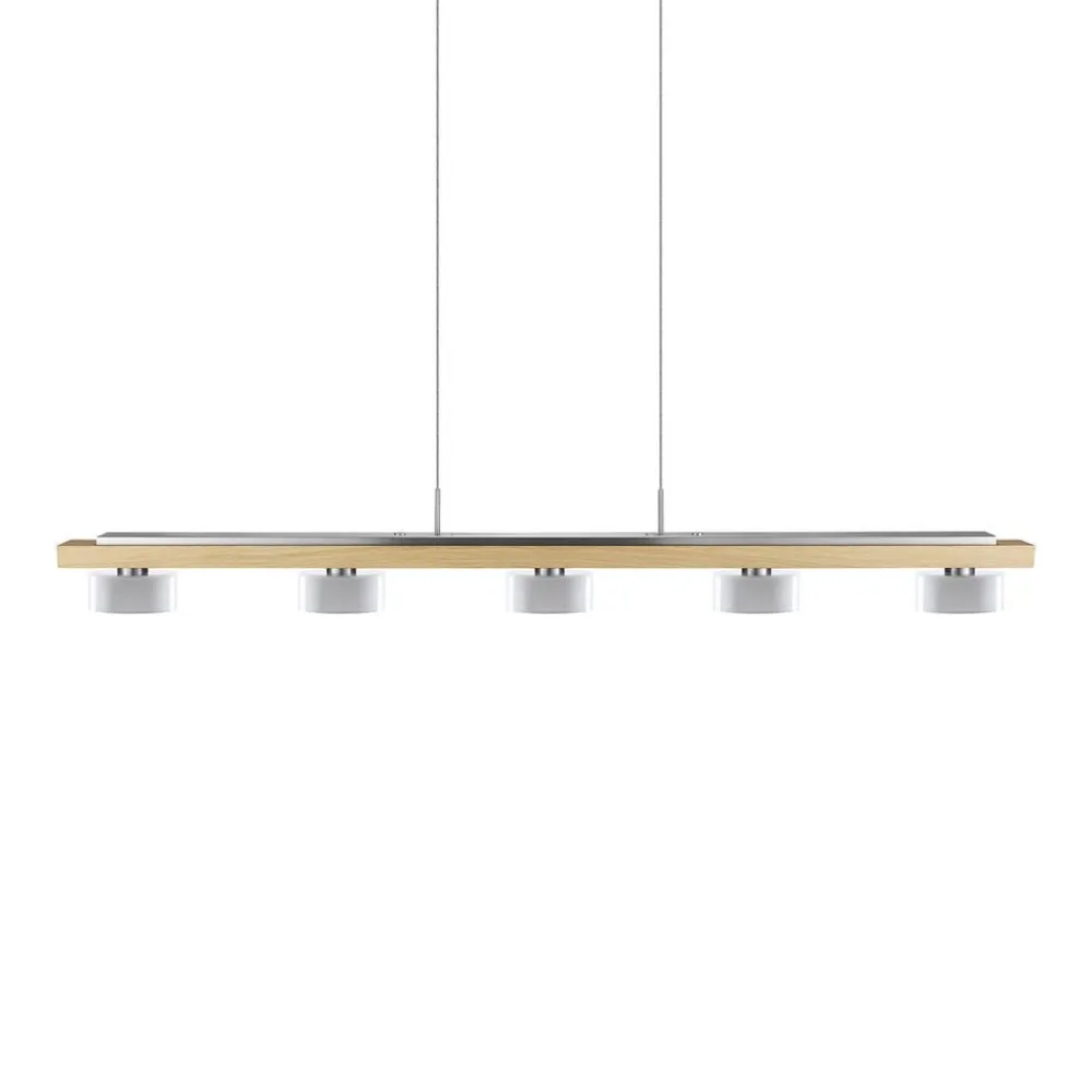 LED-pendellampe Estelle med træbjælker og glasskærme, der lyser i top og bundModerne design og naturlig udstråling er perfekt kombineret i LED-pendellampen Estelle. Baldakinen samt en stang på træpendlen er lavet af mat børstet nikkel, og derudover er der fem nedadgående skærme af opalglas. De to kabler kan afkortes før installationen; desuden kan højden på pendlen også justeres senere. Lysstyrken af de nedadstrålende LED’er i glasskærmene og det overordnede lys i toppen af bjælken kan styres separat via to berøringssensorer på bjælken – bæredygtigt træ fra FSC-certificerede leverandører – god farvegengivelse: CRI > 90 – dim-to-warm: lysdæmpning ændrer lysets farve – universalhvid for højt lysudbytte, varm hvid for lavt lysudbytte – fremstillet i Tyskland