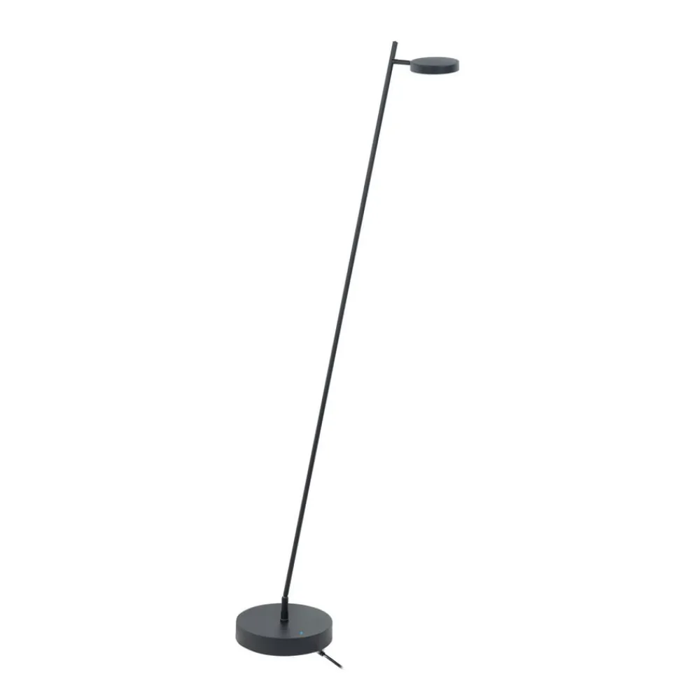 Sort Round Move LED-gulvlampe med genopladeligt batteri, lysdæmper og CCT-funktion Round Move LED-gulvlampen i sort er lavet af metal og består af en rund base, et slankt stativ og et lille, rundt hoved. Sidstnævnte kan justeres, så lyset kan rettes mod det ønskede område. Lampens kontakt gør det også muligt at dæmpe lysfarven og justere den fra varmhvid til universalhvid (CCT). Takket være det genopladelige batteri er der ikke behov for strømtilslutning under drift. I kombination med lysets justerbare lysstyrke og farvetemperatur resulterer dette i en meget fleksibel lyskilde, der kan bruges i opholdsrum fra soveværelset til arbejdsværelset.