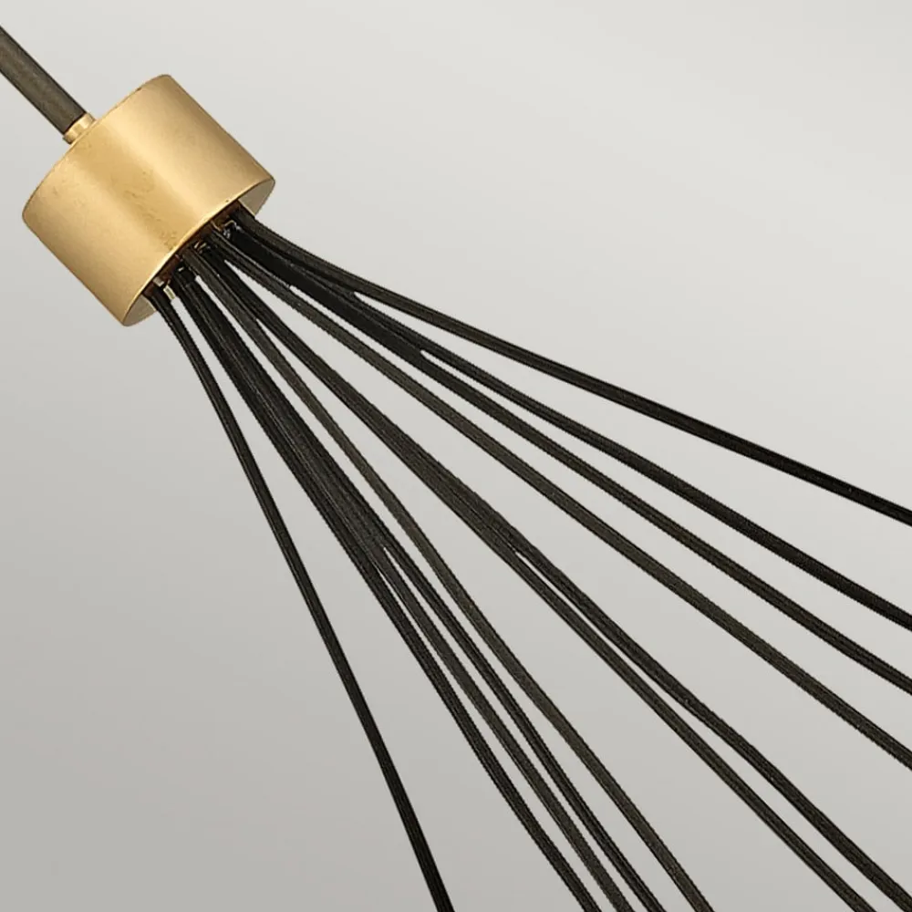 Bronzefarvet lysekrone Astrid med accenter i guld – 11-flamme Skærmen på den elleveflammede lysekrone Astrid præsenterer sig som en luftig geometrisk skønhed. Skærmen fascinerer i en mat bronzetone, og guldfarvede accenter giver endnu mere æstetik. Denne effektive lysekrone ser smukkest ud, når der bruges matchende rørformede lamper. Pærerne er ikke inkluderet i leveringen, men kan bestilles separat via tilbehør – eksternt dæmpbar