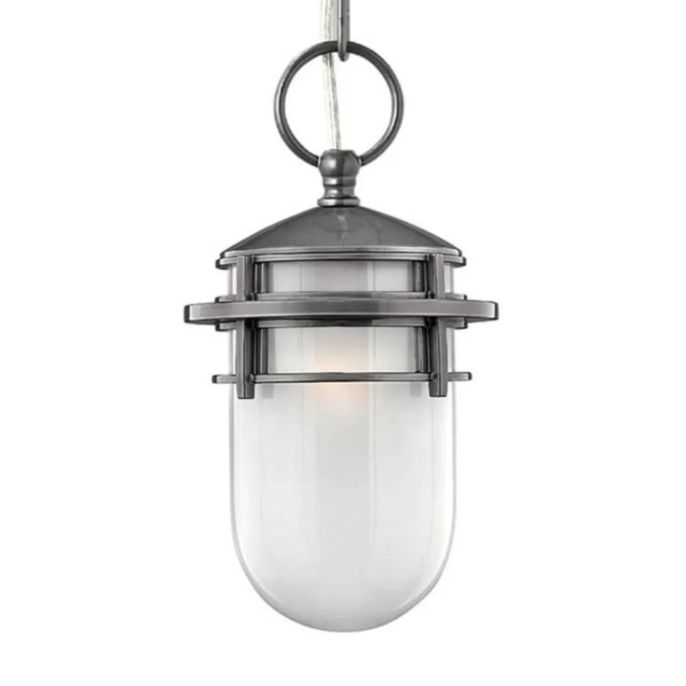 Reef pendellampe designet til det overdækkede udendørs område er umiskendeligt nautisk. Den store glasskærm lavet af ætset glas holdes på plads af stærke ringe lavet af støbt aluminium. En smuk kæde og en baldakin med maritimt design fuldender det smukke rev.