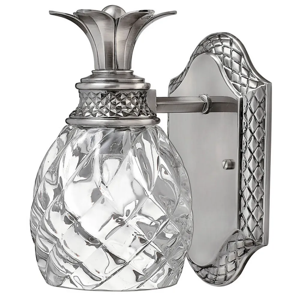 Skærmen i form af en ananas er lavet af optisk glas og giver lysstråling med en glamourøs effekt. Vægbeslaget og armaturarmen er prydet med attraktive støbte detaljer og har en flot antik nikkelfinish. Der er installeret en G9-stikdåse i Plantation. En energieffektiv, udskiftelig LED-pære er allerede inkluderet.