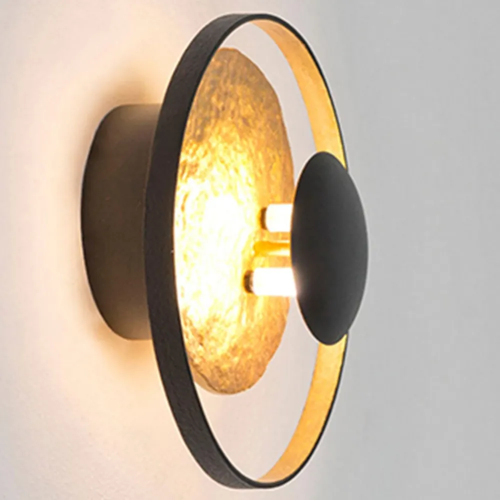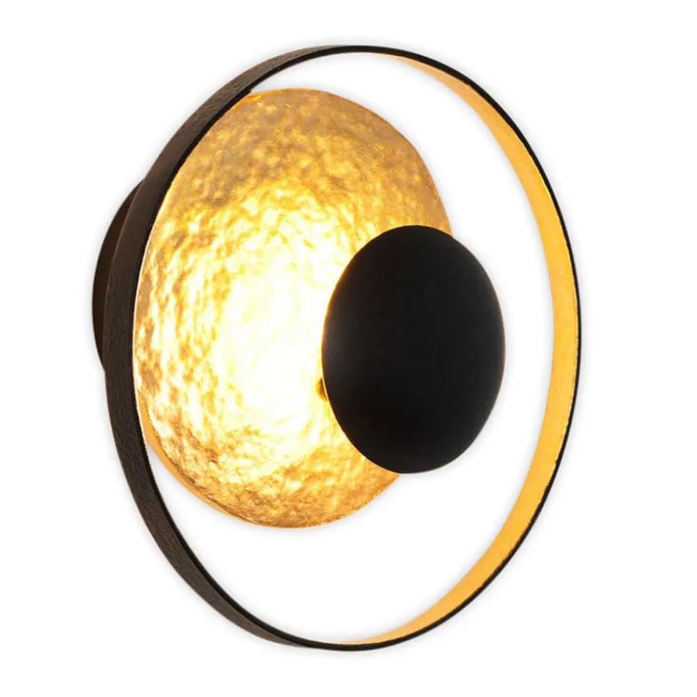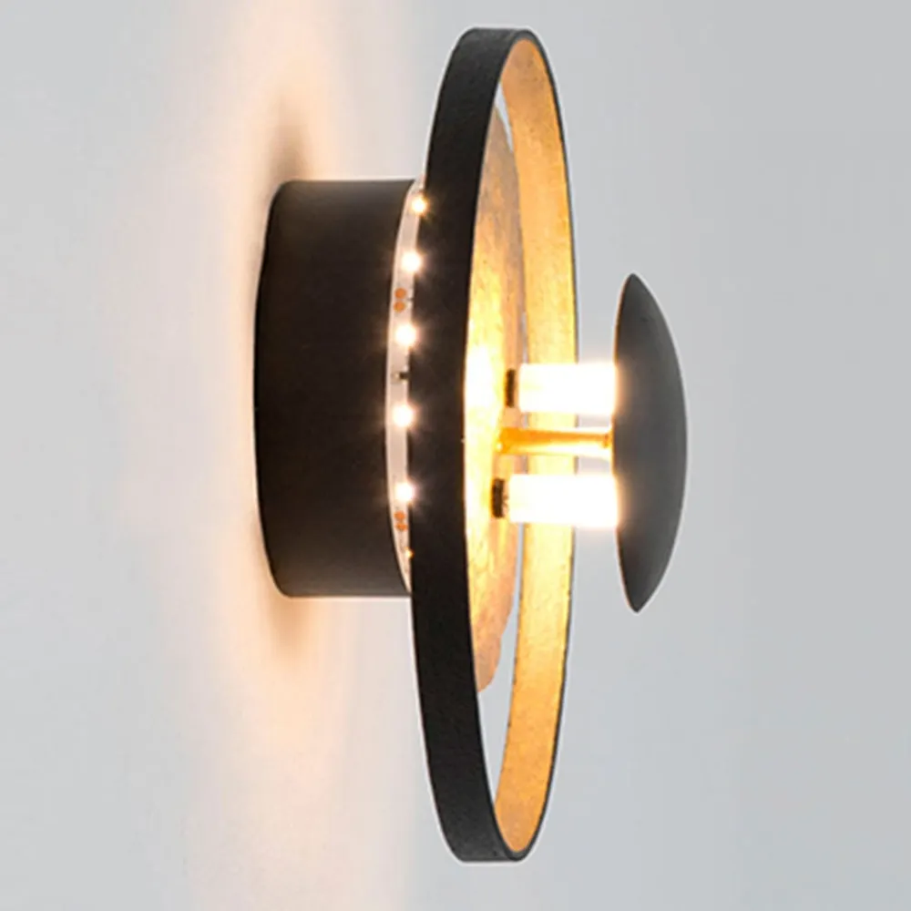 Satellitvæglampen fremkalder tilknytning til planeter og deres bane. Den ydre cirkel er lavet af jern i sort, den store skive er lavet af guldfarvet jern og den lille skive, bag hvilken lampestikkene til halogenlamperne er placeret, er lavet af sortlakeret jern. Lyset fra de anvendte lamper (medfølger ikke) og den ekstra indbyggede LED-strip udsendes indirekte i rummet og sætter samtidig selve lyset i det rigtige lys.