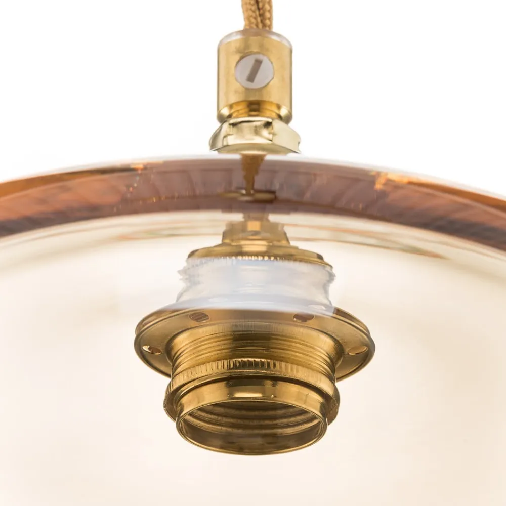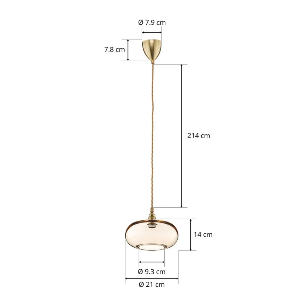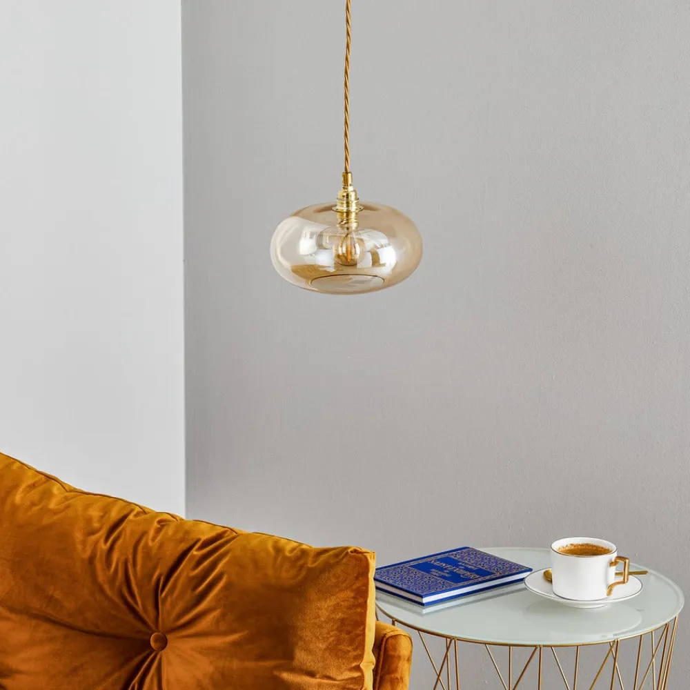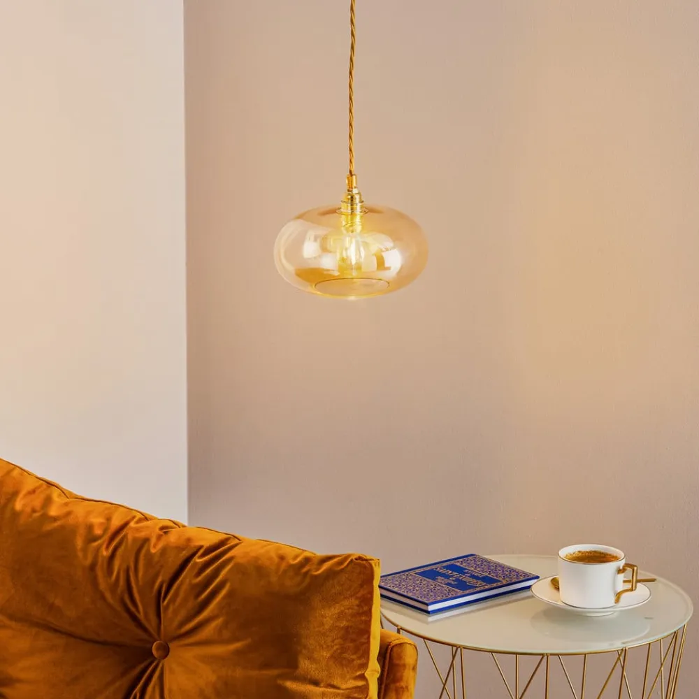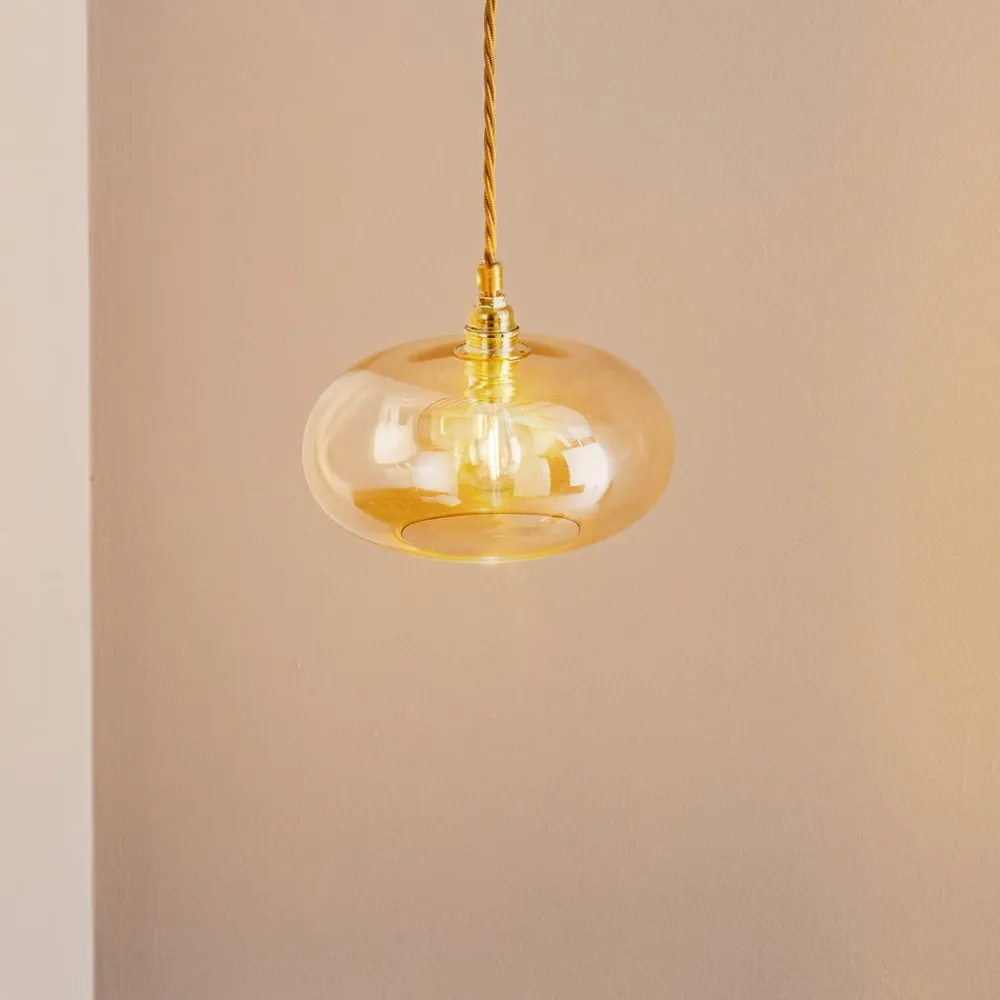 Dekorativt designet Horizon-pendel med mundblæst glasskærm Horizon-pendlen er et æstetisk blikfang og en lyskilde til særlig stemningsfuld rumbelysning alle steder i hjemmet, uanset om det er i stuen over sofabordet eller over et spisebord. Glasset er gennemsigtigt, så lampen kan ses fra alle sider, og dens lys sendes også ud i rummet fra alle sider. Det anbefales derfor især at bruge en dekorativ glødelampe. Det øger Horizon-pendlens visuelle tiltrækningskraft yderligere. Matchende lyskilder fås i tilbehørssektionen. Skærmen er lavet af mundblæst glas. Hver lampe er unik; på grund af fremstillingsprocessen kan der være små variationer såsom små luftindeslutninger etc. – fremstillet af EBB & FLOW (Danmark) – med vævet, snoet tekstilledning i guld