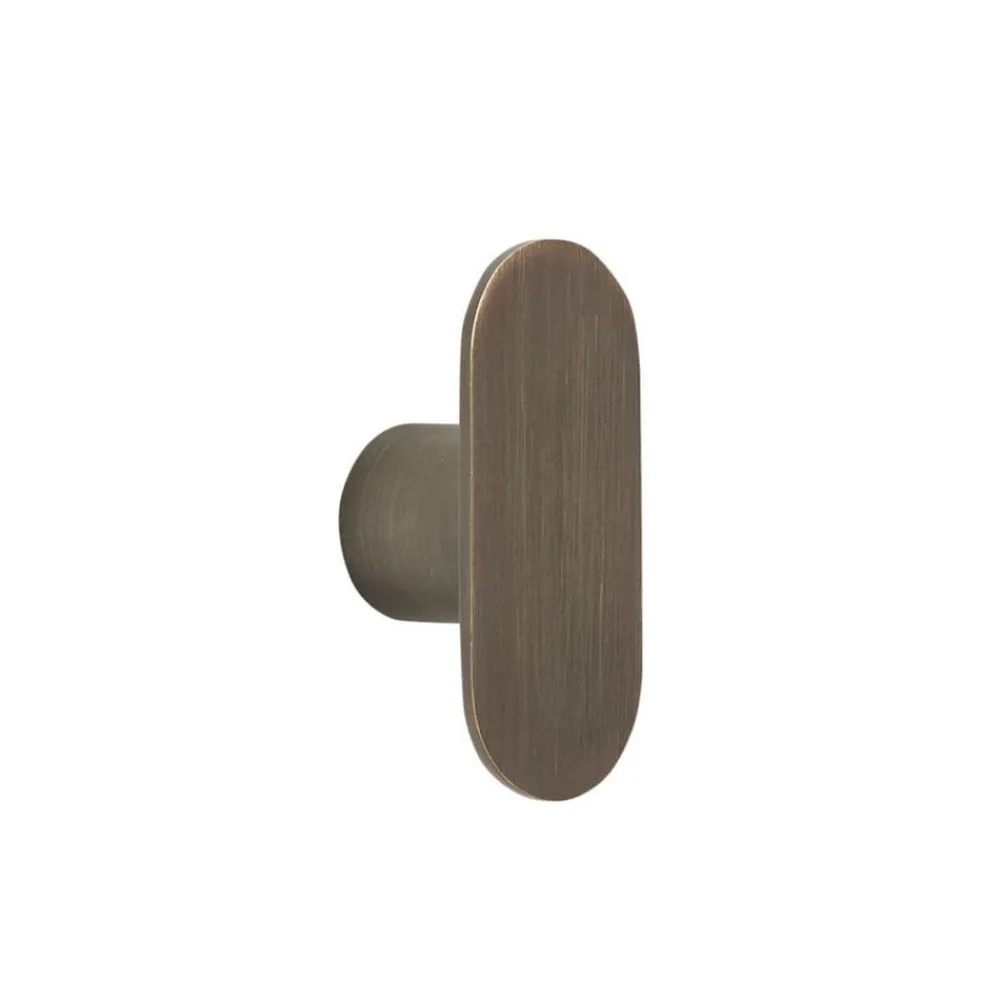 Enkelt knage Piccolo lavet af jern Knagen er lavet af jern, farven er bruneret messing. Formen er enkel og minimalistisk og optager meget lidt plads.