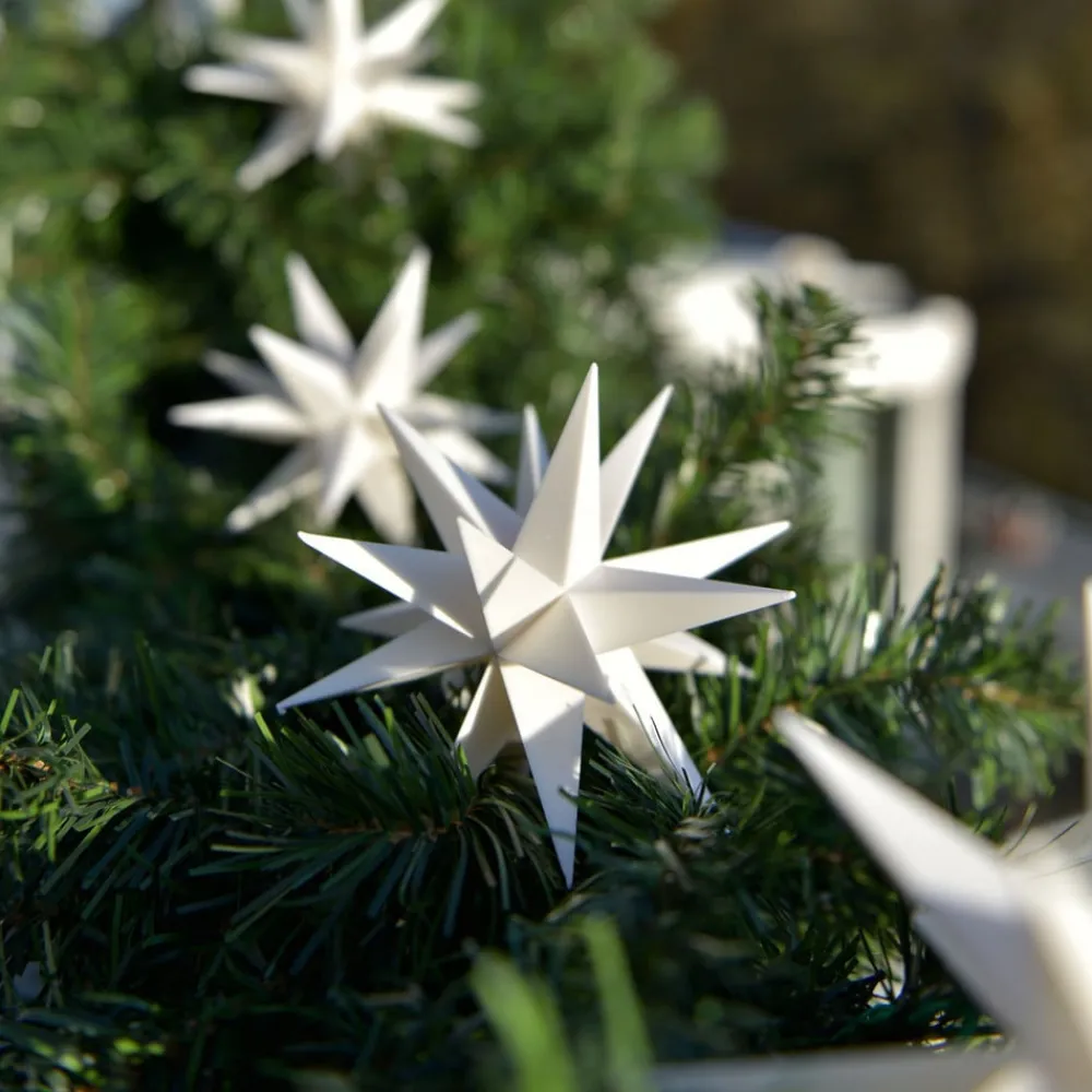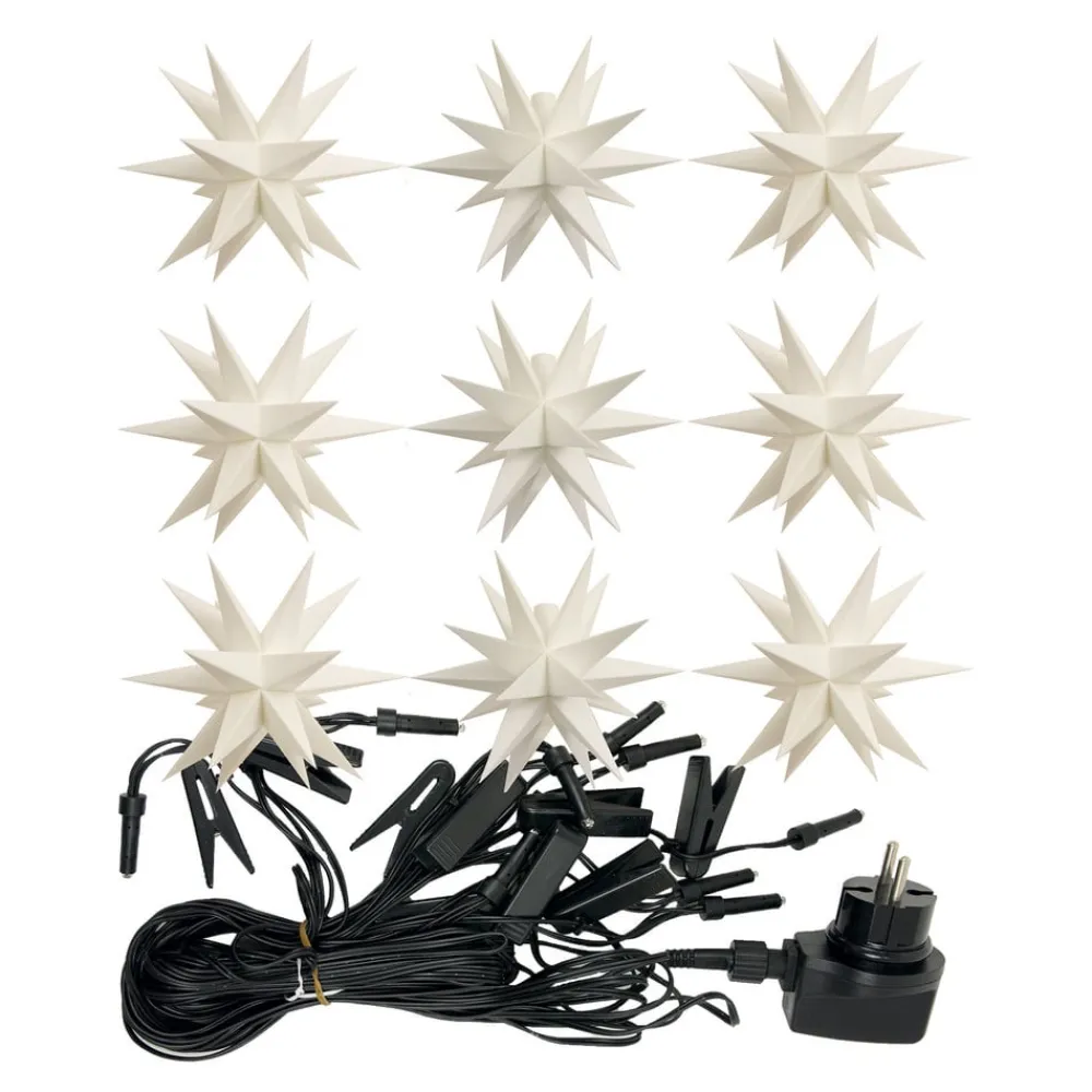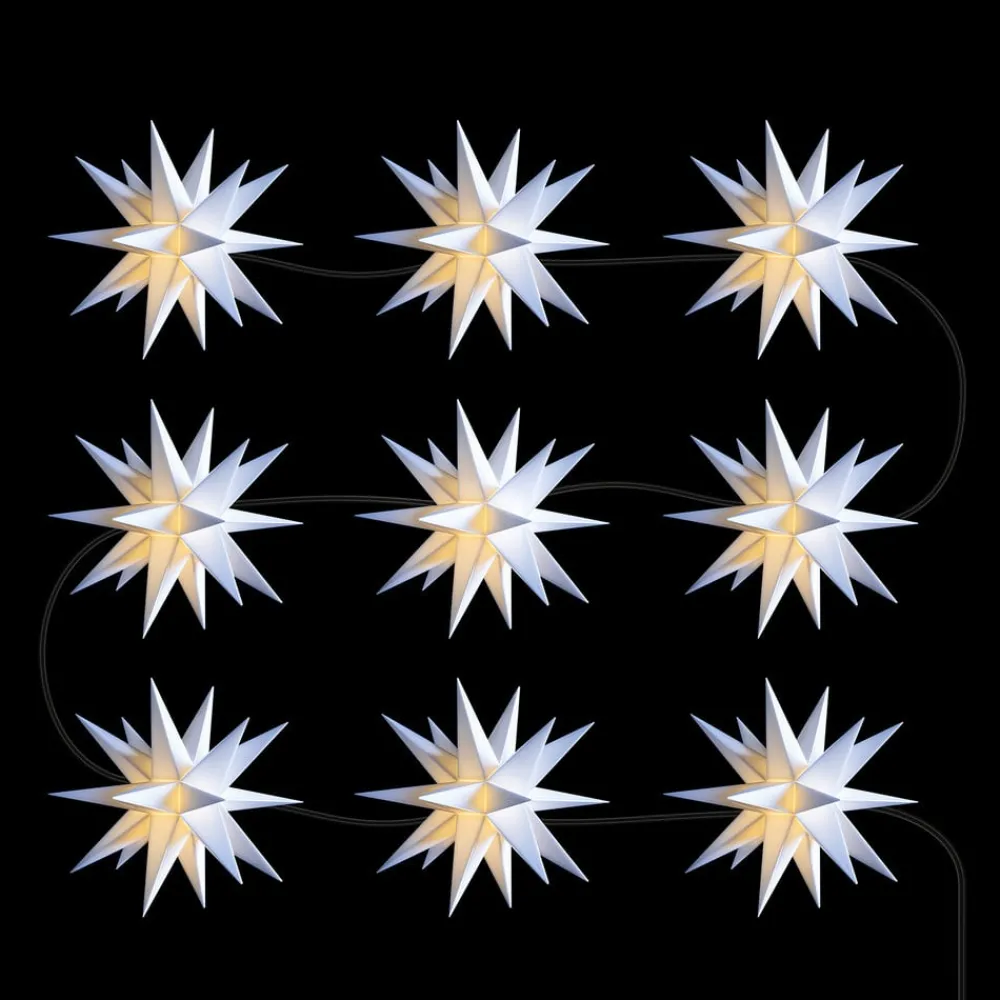 Ni dekorativt designede plastikstjerner med 18 spidser pryder lyskæden, som kan bruges både indendørs og udendørs og er ideel til at dekorere f.eks. træer og guirlander. I de mørke aften- og nattetimer skaber de indbyggede lysdioder en stemningsfuld belysning af omgivelserne; om dagen virker stjernerne alene på grund af deres æstetiske form. Udstyret med sort kabel. Inkluderer udendørs transformer og monteringsbeslag.