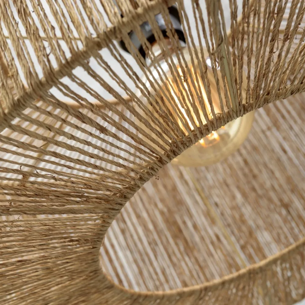 Rund loftslampe Iguazu lavet af jute Iguazu er opkaldt efter vandfaldene på grænsen mellem Brasilien og Argentina, de er de største vandfald i Sydamerika og et populært udflugtsmål. Når vandet strømmer nedad, gør de fine linjer i den runde paraply det også. Deres parallelle placering og den tætmaskede udførelse får dem til at ligne vandløb, der giver et kig ind i interiøret gennem fine huller. Lyset trænger ubesværet ind i rummet og skaber stemningsfulde lysbilleder. Den øverste åbning skaber et blødt, indirekte lys, mens den nederste oplyser rummet direkte. Loftslampen er lavet af den populære naturfiber jute, som er kendetegnet ved sine særlige egenskaber. Udover sin robusthed anses jute for at være meget strækbart og rivefast, men bæredygtige aspekter bør også fremhæves. Det vigtigste dyrkningsområde er frugtbar alluvial jord, som gør, at den krævende juteplante ikke behøver at blive gødet. Det er en stor fordel for miljøet og landmændene sammenlignet med intensiv bomuldsdyrkning. Det er aspekter, der passer til den grundlæggende idé hos det hollandske mærke Good & Mojo, som med sin kollektion ønsker at skabe bæredygtige lamper, der samtidig gør godt.