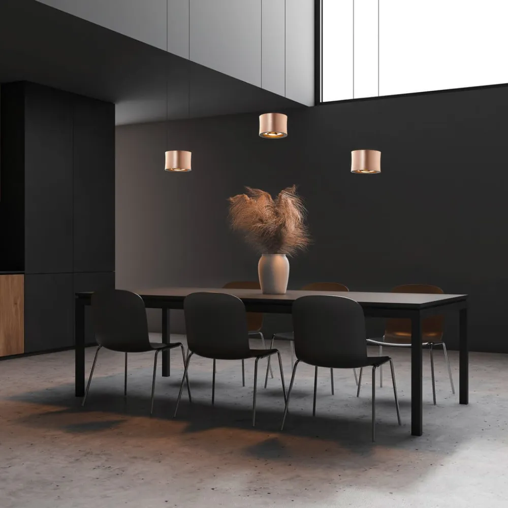 Usædvanligt smukt designet Impulse LED pendelarmaturNavnet “Impulse” passer perfekt til dette pendelarmatur, for det er præcis, hvad det er. De små, cylindriske lys i dette tre-lampe Impulse LED-pendelarmatur er meget kompakte og har alligevel en enorm effekt på selve rummet og frem for alt på lysstemningen i rummet.Produktdesigneren Bernd Beisse, der er ansvarlig for designet af dette armatur, har udviklet en diffusor, der giver en bred lyskegle og samtidig er helt blændfri. De tre lys skinner både opad og nedad og sætter den sorte loftsbase og f.eks. et smukt spisebord under lampen perfekt i scene. De wafertynde sorte kabler, som lamperne er ophængt i, virker næsten usynlige foran en mørk væg, og de rosé-guld-anodiserede lamper synes således bogstaveligt talt at svæve.Hængelampen kan dæmpes via en opstrøms vægdæmper.