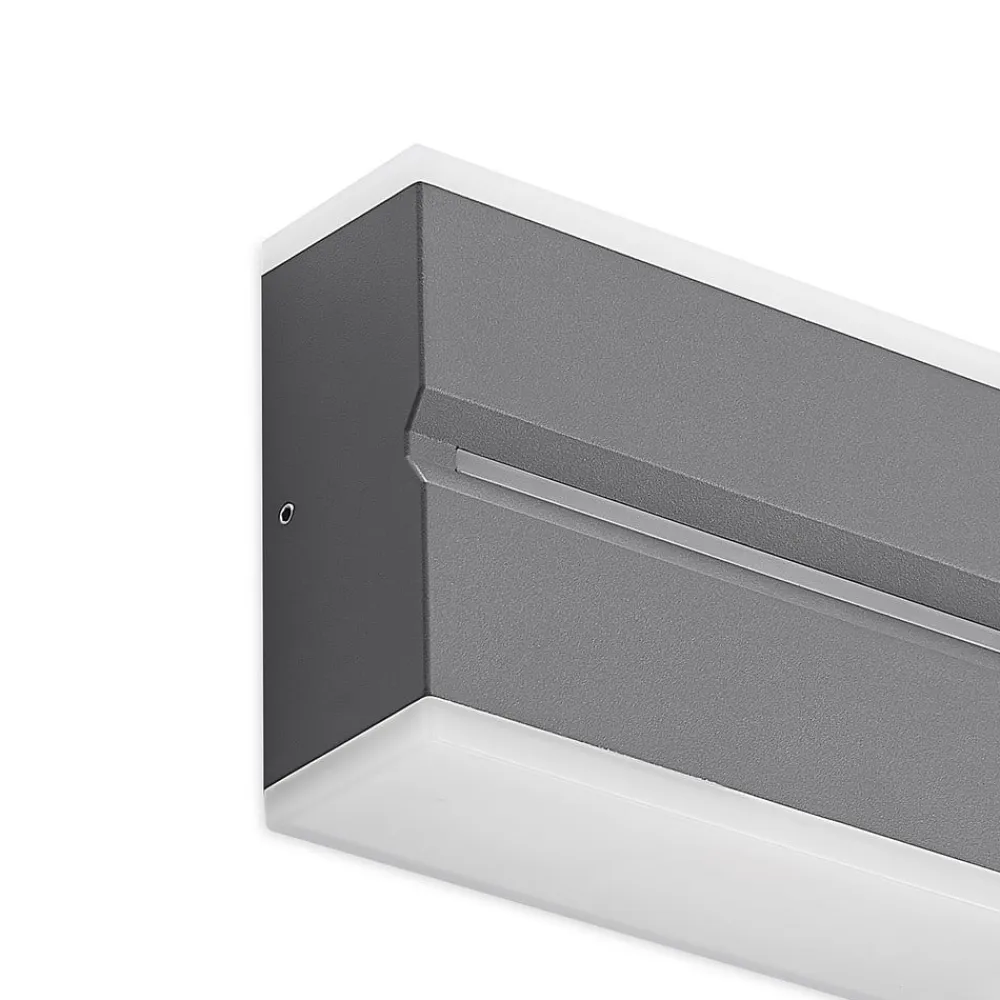Mørk Itarion LED udendørs-væglampe med opalhvide skærme Itarion LED udendørs-væglampen har et kantet hus af trykstøbt aluminium i en trendy mørkegrå farve. Armaturet har også to skærme af opalhvid polykarbonat, som harmonerer godt med det ellers mørke design. Skærmene fungerer også som diffusorer, så lyset ikke er direkte, men blødere og mere jævnt. De varmhvide LED’er er både lyse og energibesparende, og deres bløde lys skaber en indbydende atmosfære i indgangspartiet.