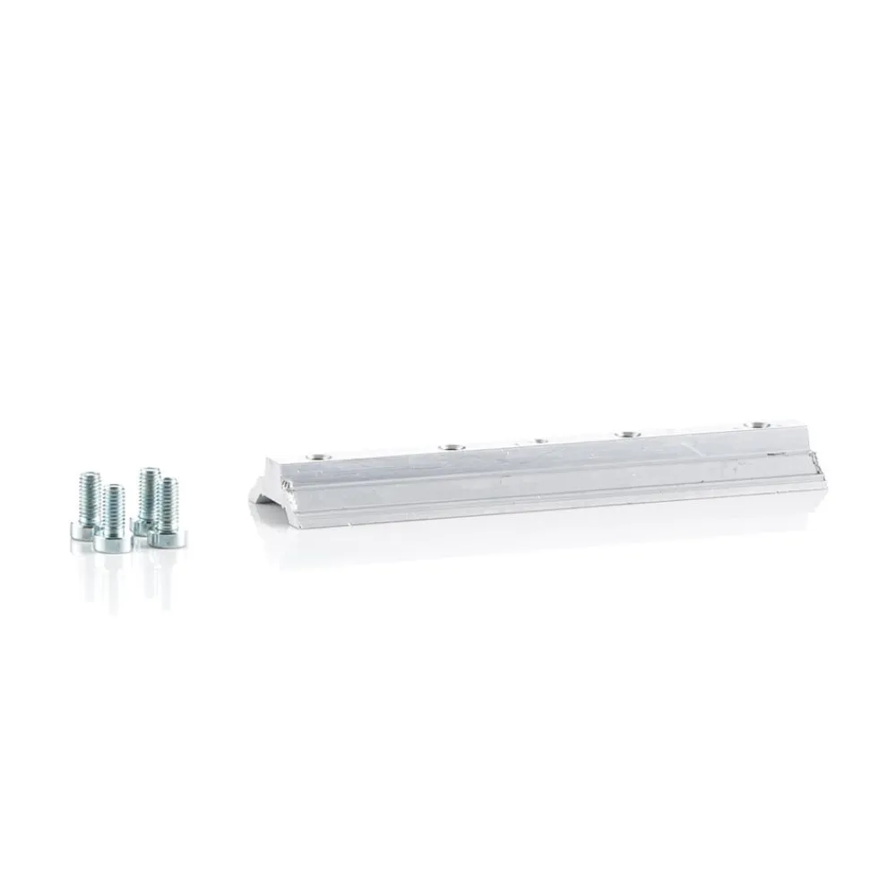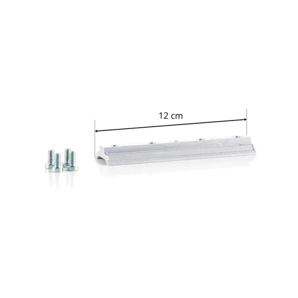 Denne 12 cm lange fastgørelsesplade af aluminium med 4 skruer fungerer som stødstykke mellem pendulophæng og LKM 3-fase skinner fra Ivela.