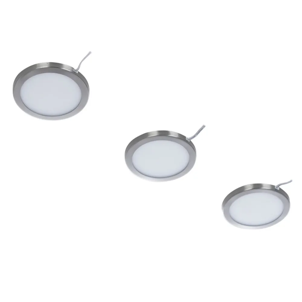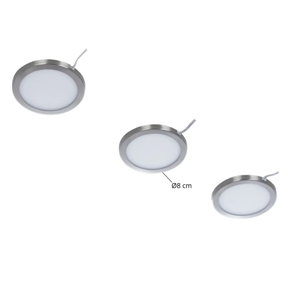 Rundt LED-underskabslampe Jopos i et sæt af tre, dæmpbarDette sæt af underskabslamper giver praktiske tjenester i stuen og køkkenet. De enkelte lamper er runde og sat ind i en ramme med satin-nikkelfinish. De kan ikke bare tændes og slukkes, men også dæmpes i tre trin (15% – 50% – 100%).