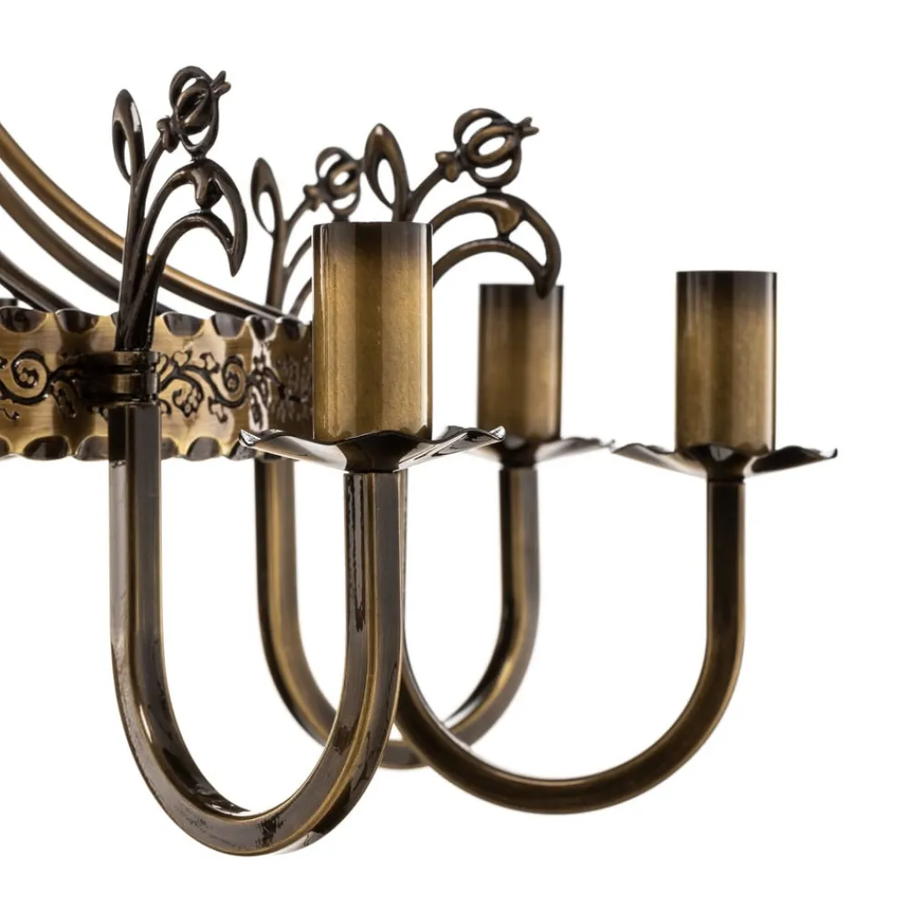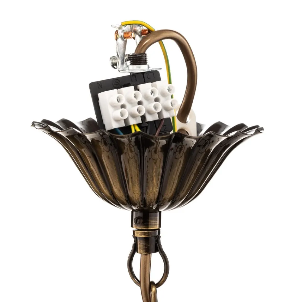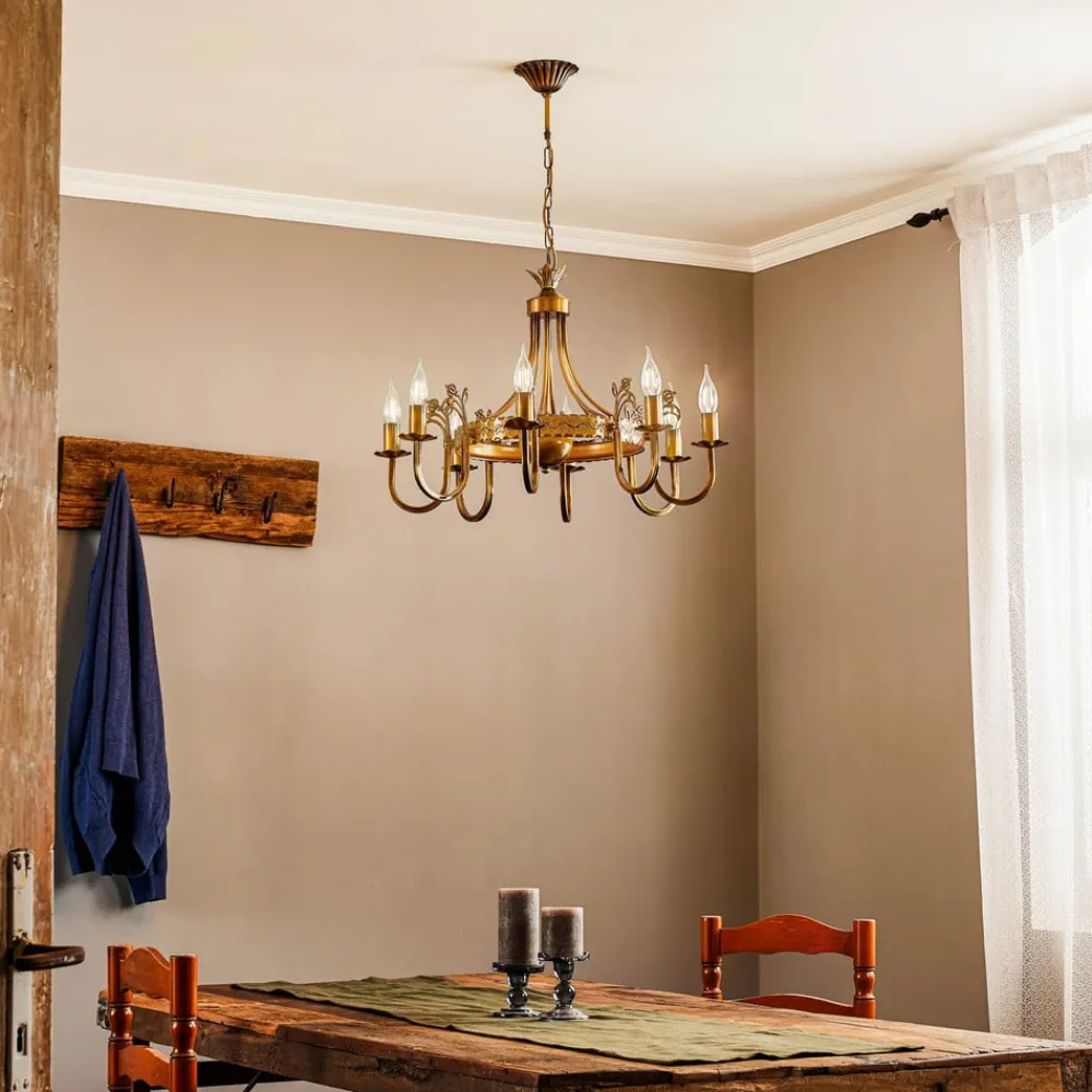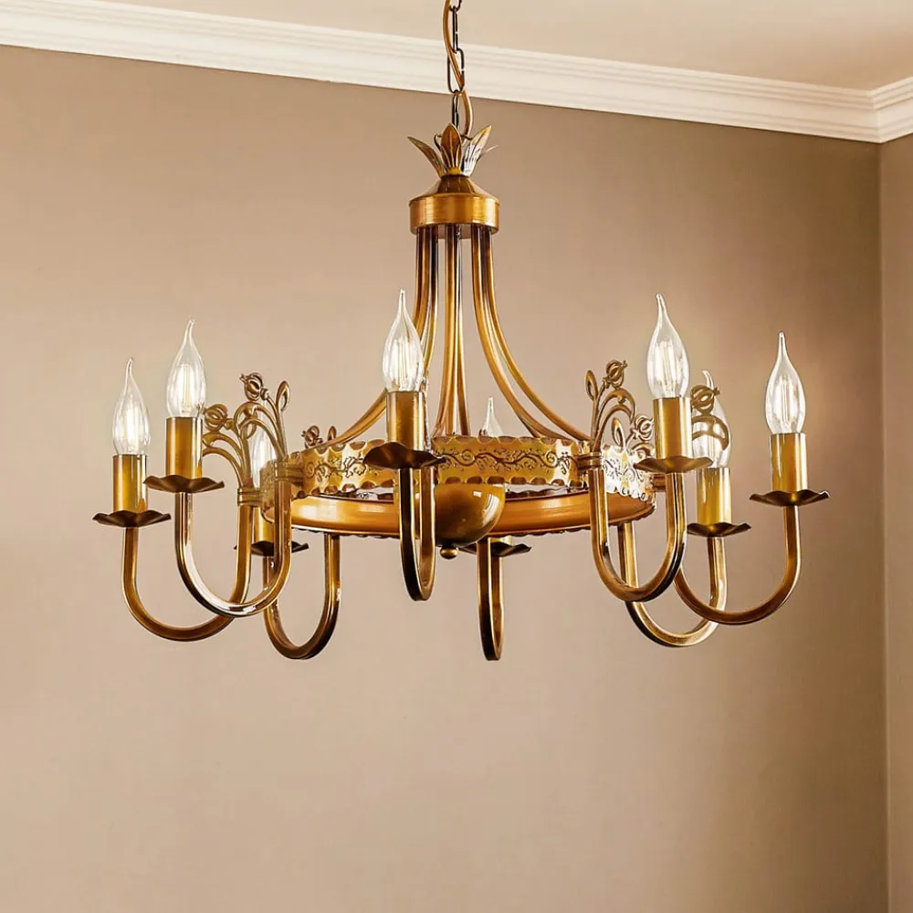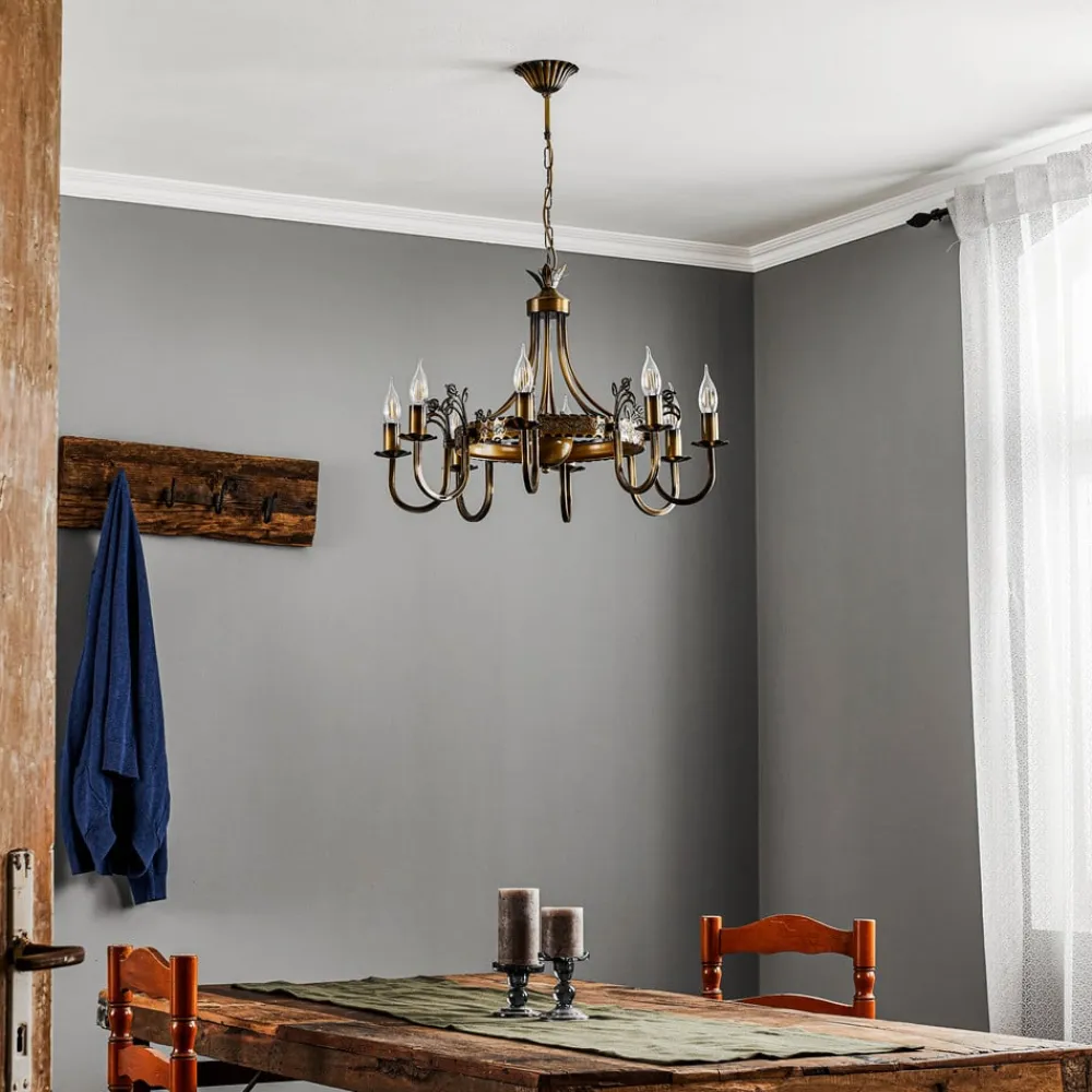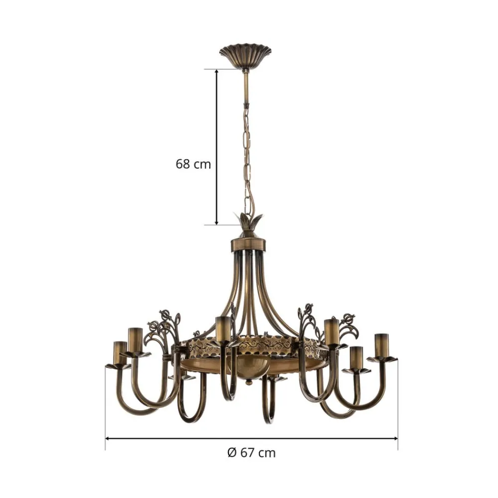 Lysekrone Castle lys patineret med 8 lyskilder forener klassisk elegance med et strejf af antik. Fremstillet af højkvalitets metal i en tiltalende lys patineret messingfarve giver denne lysekrone ethvert stue eller spisestue et særligt præg. Det kunstfærdige design og de otte lyskilder sikrer en jævn og imponerende belysning af rummet.