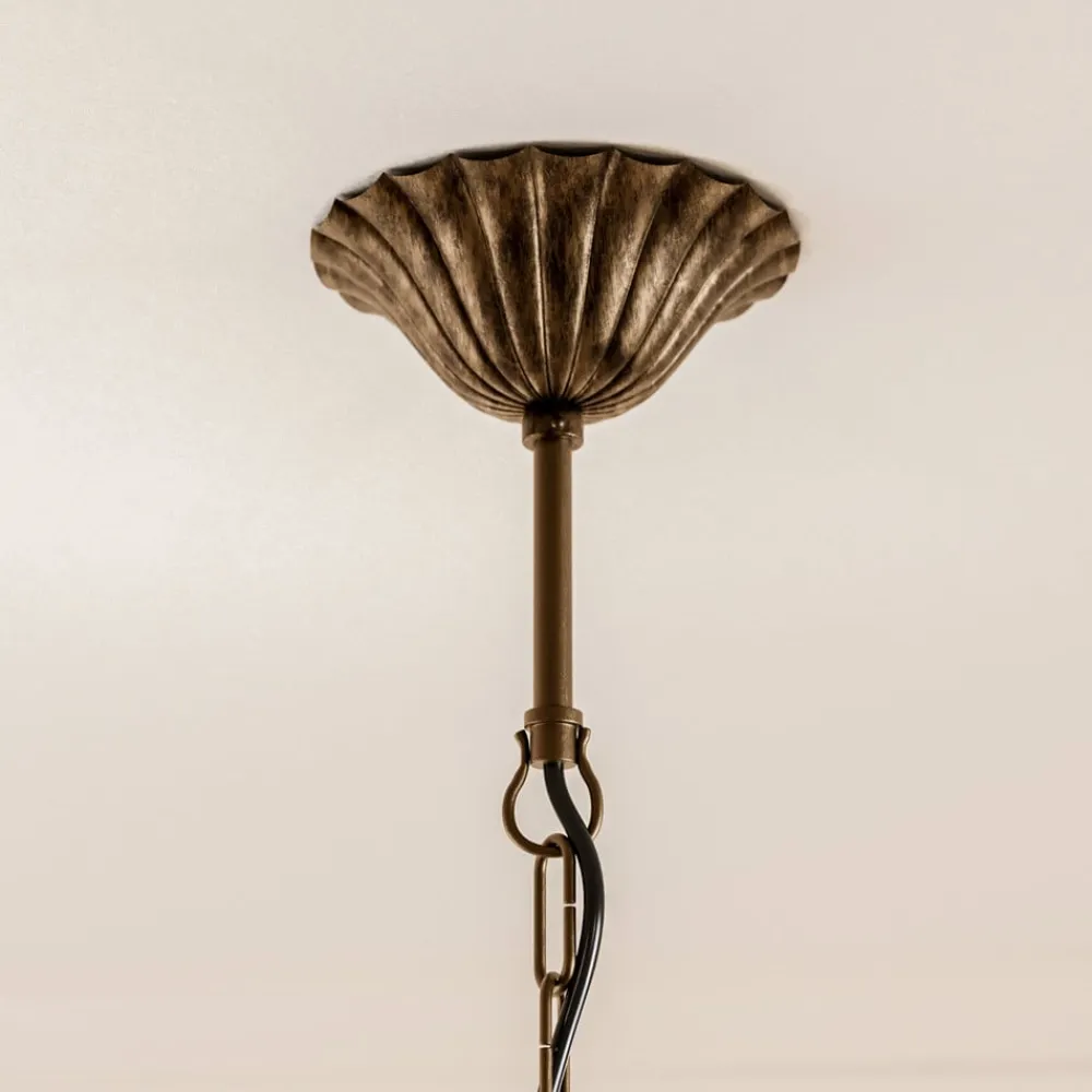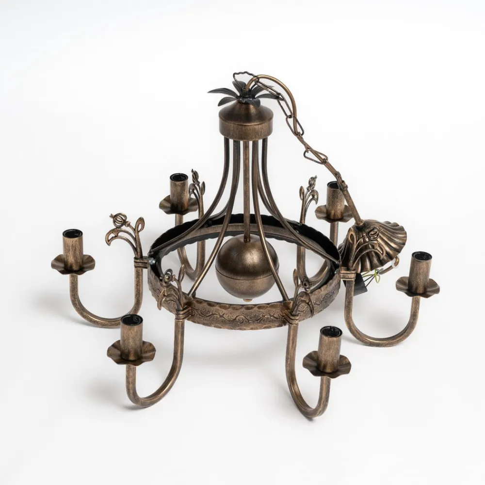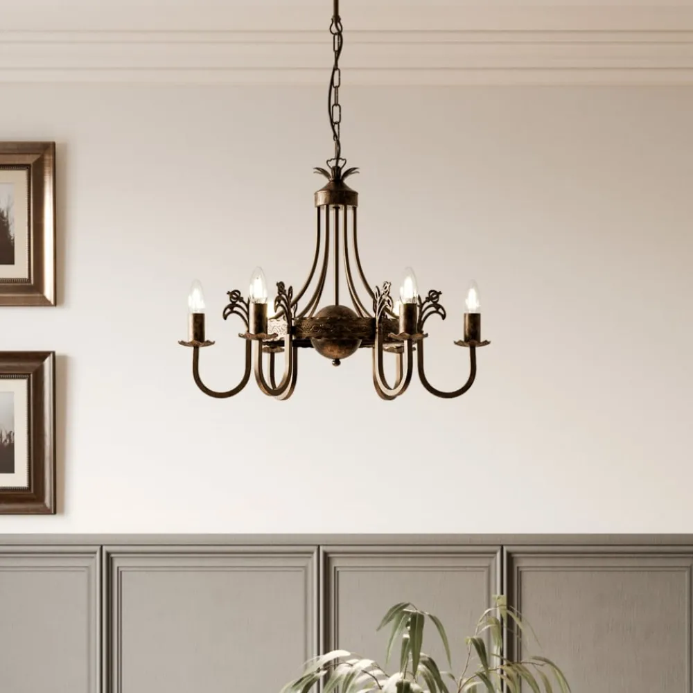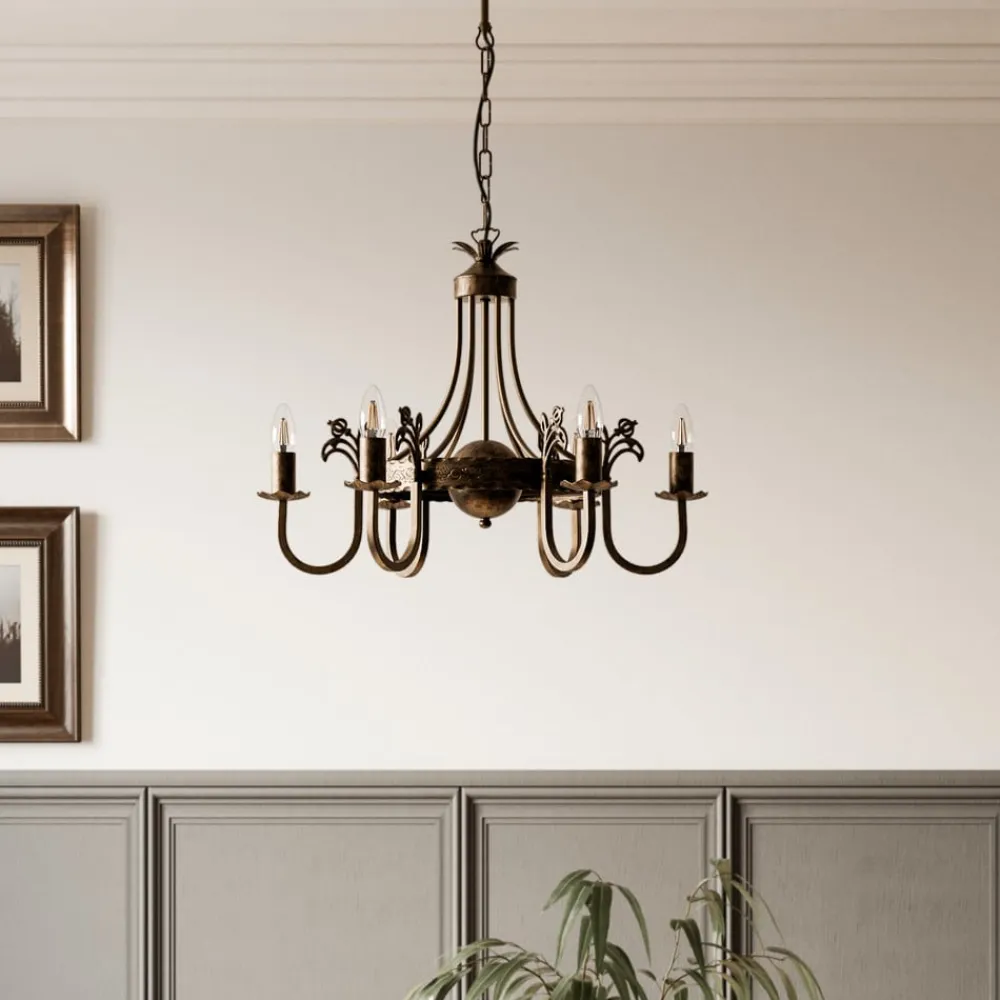 Lysekrone Castle imponerer med sit antikke design og den høje kvalitet i metallet. Den mørke patinerede messingfarve giver lysekronen en tidløs elegance, der skaber en stilfuld atmosfære i både stuen og spisestuen. Med sine seks flammer er den en generøs lyskilde, der bader ethvert rum i et varmt og indbydende lys.