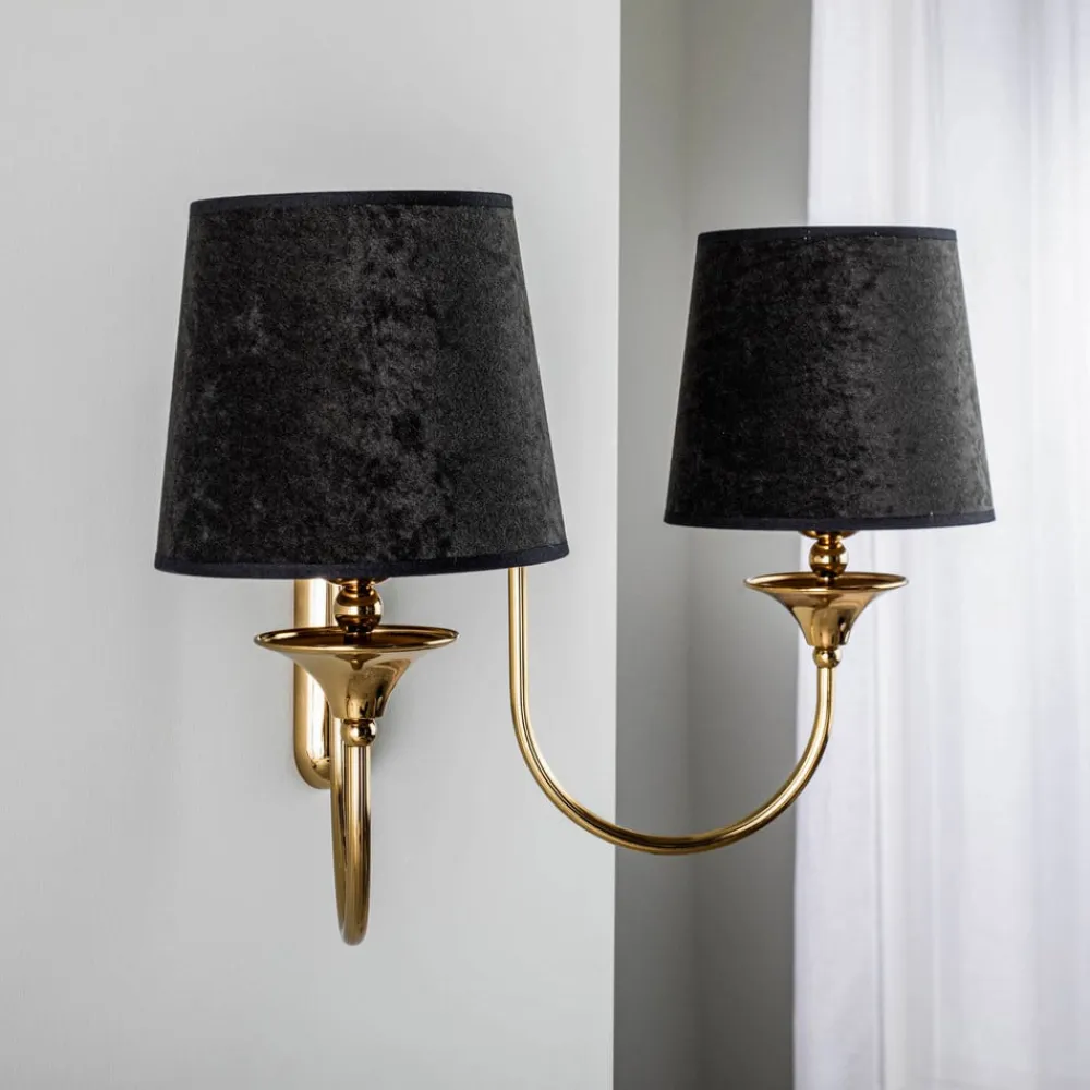 Væglampe Baranio med stofskærme kombinerer klassisk design med moderne funktionalitet. Fremstillet af højkvalitets messing og eksklusivt stof passer den harmonisk ind i forskellige boligområder som stuen, soveværelset, entreen og spisestuen. Konstruktionen med 2 lyskilder sikrer en jævn og behagelig belysning, der skaber både hyggelige og inspirerende atmosfærer.