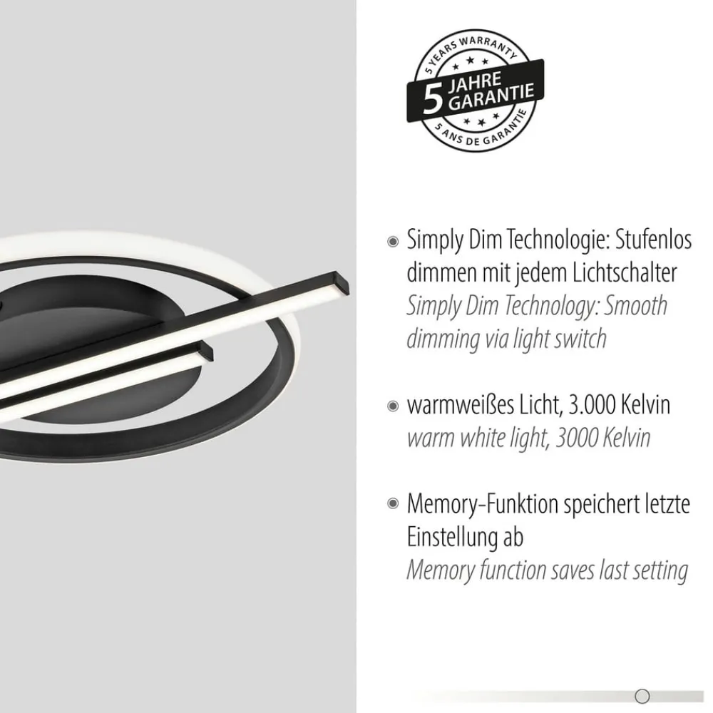 Trinløs dæmpning med vægkontakten: Korsa LED-loftslampe Korsa LED-loftslampen har et moderne design og er også udstyret med de praktiske funktioner, man forventer af en moderne lampe. Den kan dæmpes trinløst fra 100 til 10 % med den almindelige vægkontakt, og takket være hukommelsesfunktionen genstarter den med præcis den indstilling, der blev indstillet, da den sidst blev slukket, næste gang den tændes.