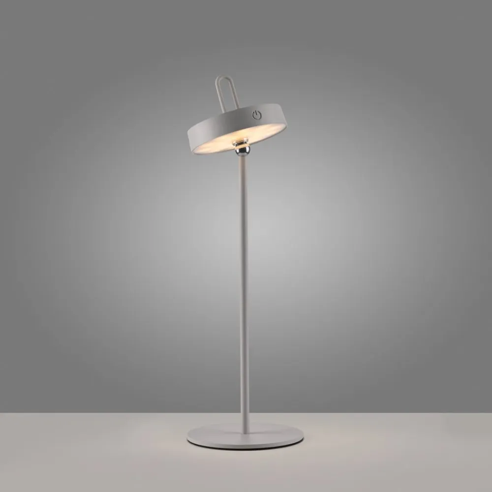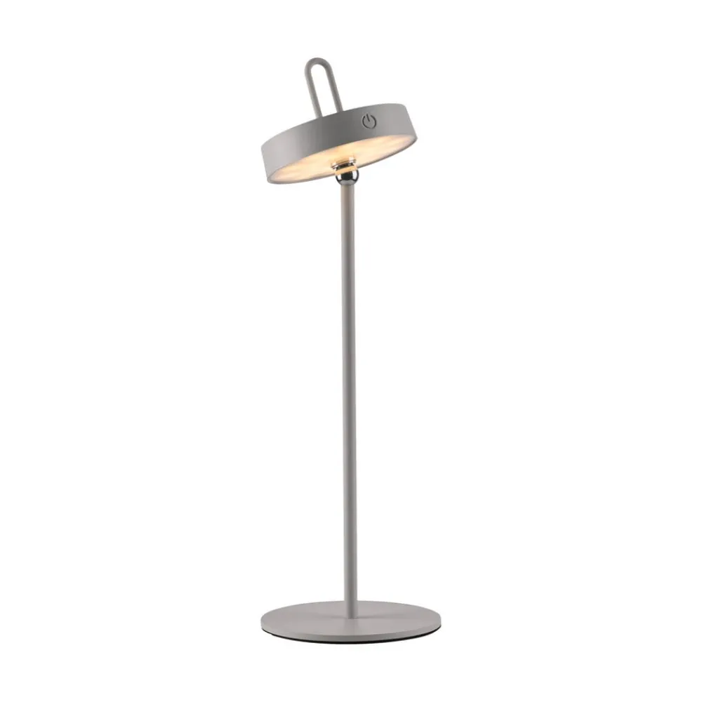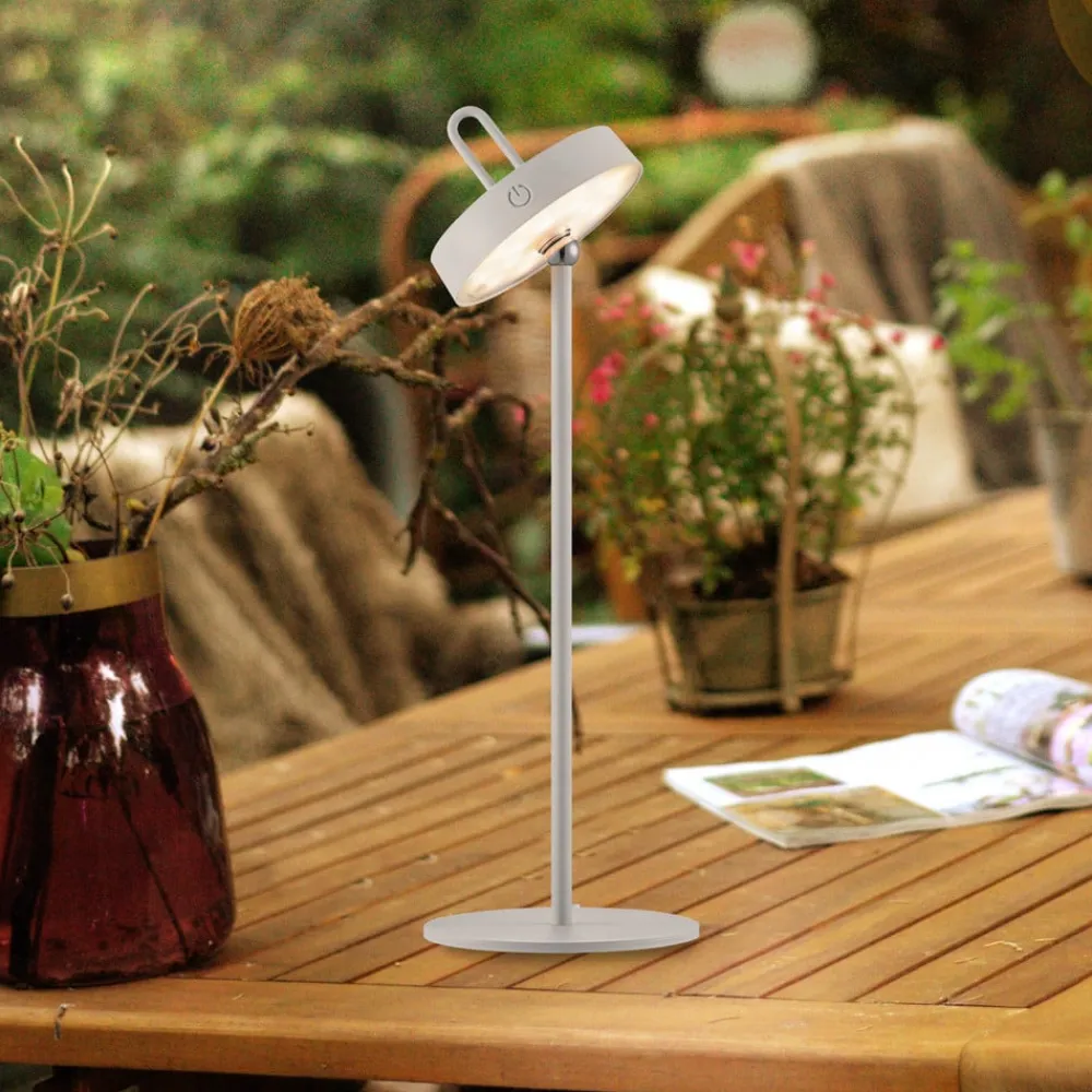 Amag mobil LED-bordlampe med justerbart hoved Amag LED-bordlampen af metal er en moderne og fleksibel ekstra lyskilde. Det runde hoved kan vippes hele vejen rundt takket være et kugleled. Det integrerede LED-spotlight skinner nedad og tændes og dæmper ved hjælp af knappen på siden af hovedet. Udstyret med et genopladeligt batteri kan Amag betjenes uden strømtilslutning og er også det ideelle HighLight til haven og terrassen takket være sin stænkbeskyttelse – Kapslingsgrad: IP44 – Opladningstid: 4 timer – Brændetid ved høj lysstyrke: 7 timer