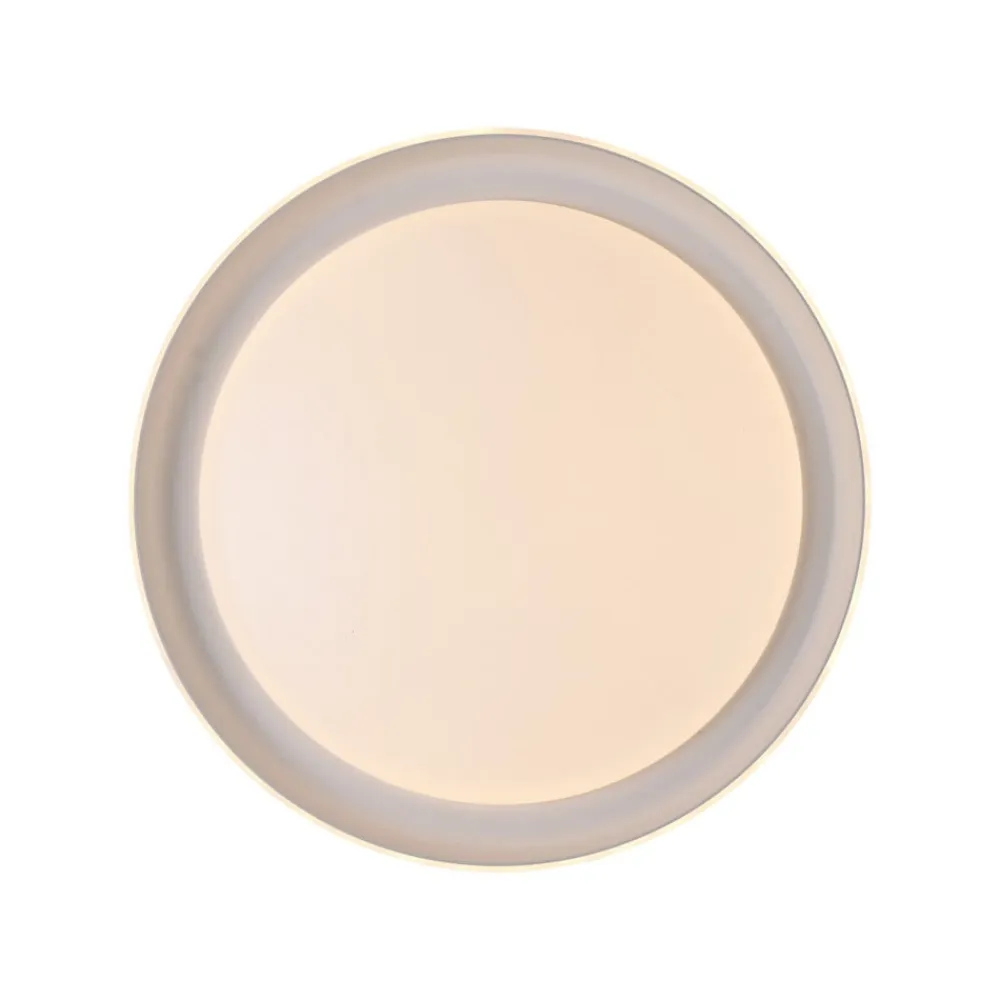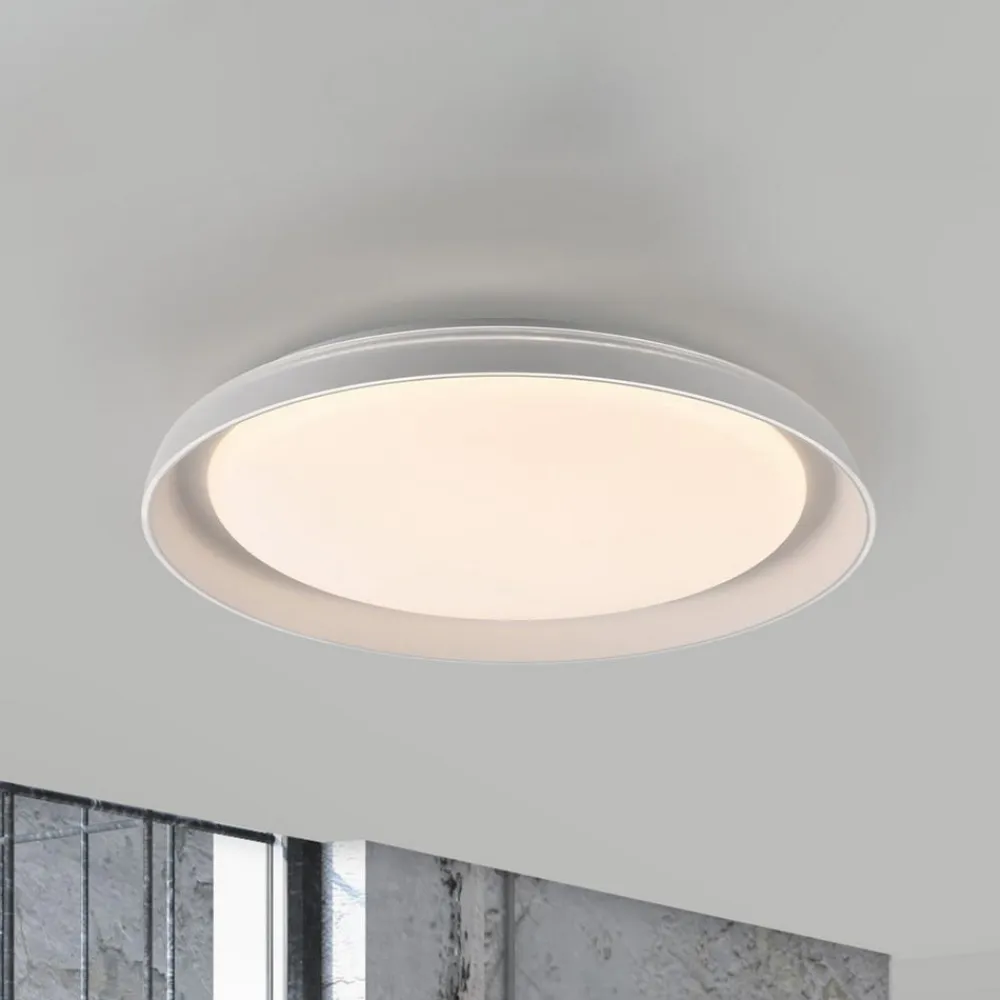 Sati LED-loftlampe, dæmpbar via lyskontakt Den runde Sati loftlampe er udstyret med en satineret diffuser nederst og en gennemsigtig ring øverst i den flade skærm, hvilket skaber en ensartet rumbelysning og lidt indirekte lys, der skaber en ring af lys i loftet. En særlig funktion ved armaturet er, at det kan dæmpes ved hjælp af lyskontakten. Lyset kan skiftes til tre forskellige lysstyrker ved gentagne skift og dermed tilpasses ethvert belysningsbehov. Hukommelsesfunktionen gemmer det sidst valgte lysstyrkeniveau, indtil næste gang lyset tændes.