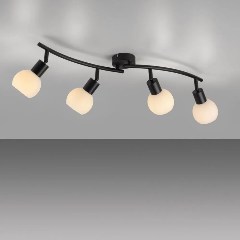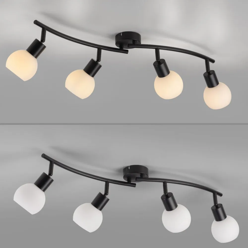 Loki loftlampe af jern og glas, 4-lampet med LED-pærer E14 Den lange, 4 lyskilder store Loki loftlampe består af en sortlakeret jernramme og fire næsten kugleformede glasskærme. Den er en allrounder til mange områder i hjemmet, f.eks. stuer, gange og soveværelser. Lyset kan justeres efter behov. LED-pærer med E14-sokkel og varmhvid lysfarve medfølger og kan udskiftes.