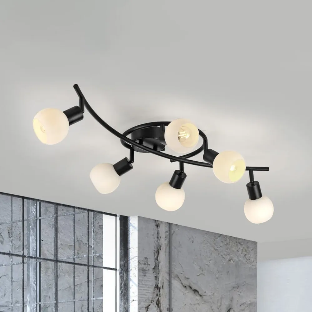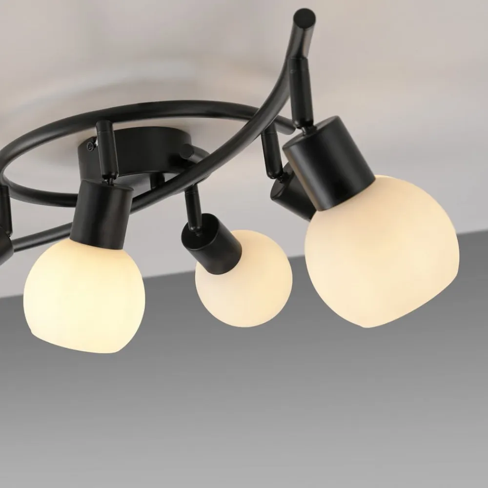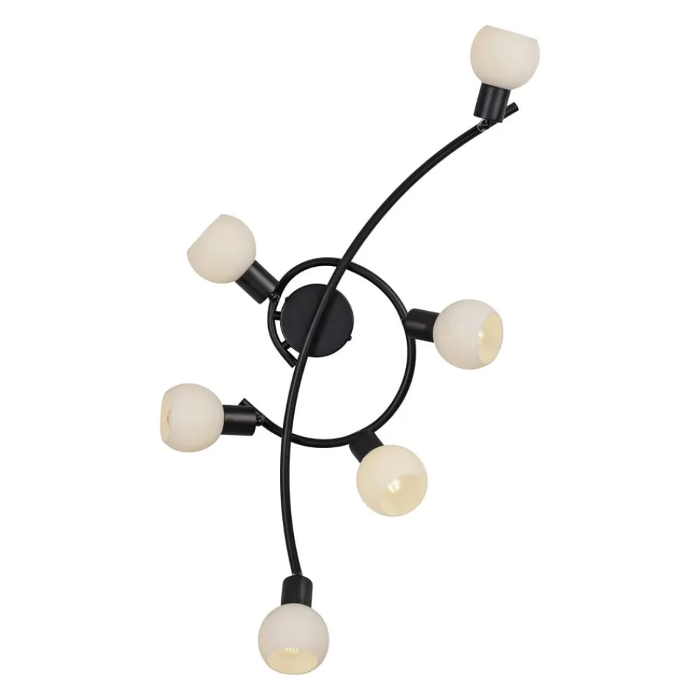 Loki-loftlampe af jern og glas, 6 lyskilder med LED-pærer E14 Loki-loftlampen med 6 lyskilder består af en sortlakeret jernramme med buede arme, hvorpå de næsten sfæriske glasskærme er monteret. Det er en allrounder til mange områder i hjemmet, uanset om det er stuen, soveværelset eller gangen. LED-pærer med E14-sokkel og varmhvid lysfarve medfølger og kan udskiftes.