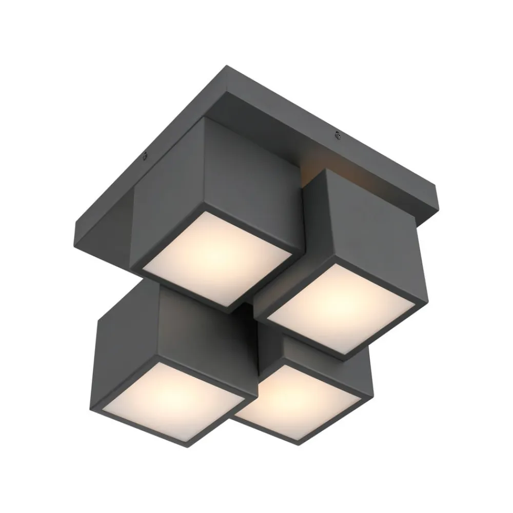 Loftlampe Tetris med kantet look Den kantede ED-loftlampe Tetris er lavet af metal og er udstyret med fire kubeformede lyselementer, der sidder i forskellige højder under den kantede baldakin. Hver kube er lukket i bunden med et satineret dæksel, så der sendes et homogent lys ud i rummet. Noget af lyset spotlightes også mod loftet, hvilket skaber smukke lyseffekter – Ikke dæmpbar – Monteringsmateriale medfølger