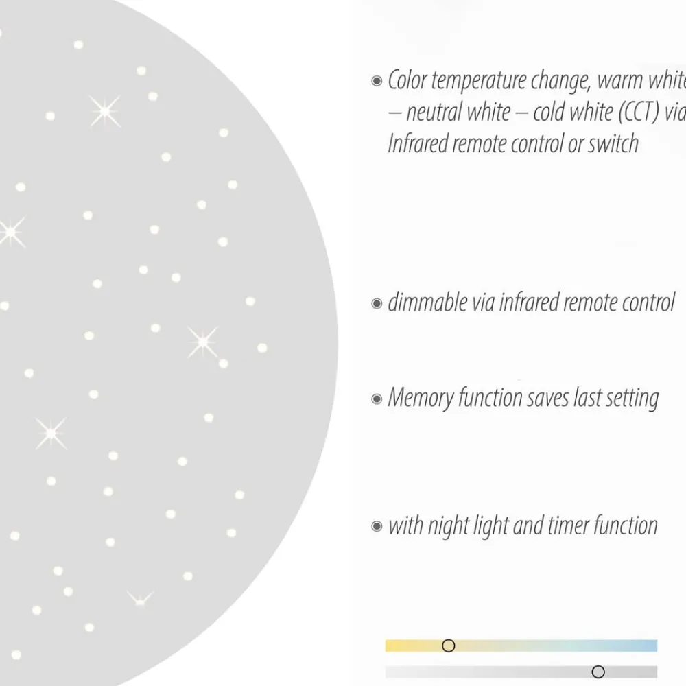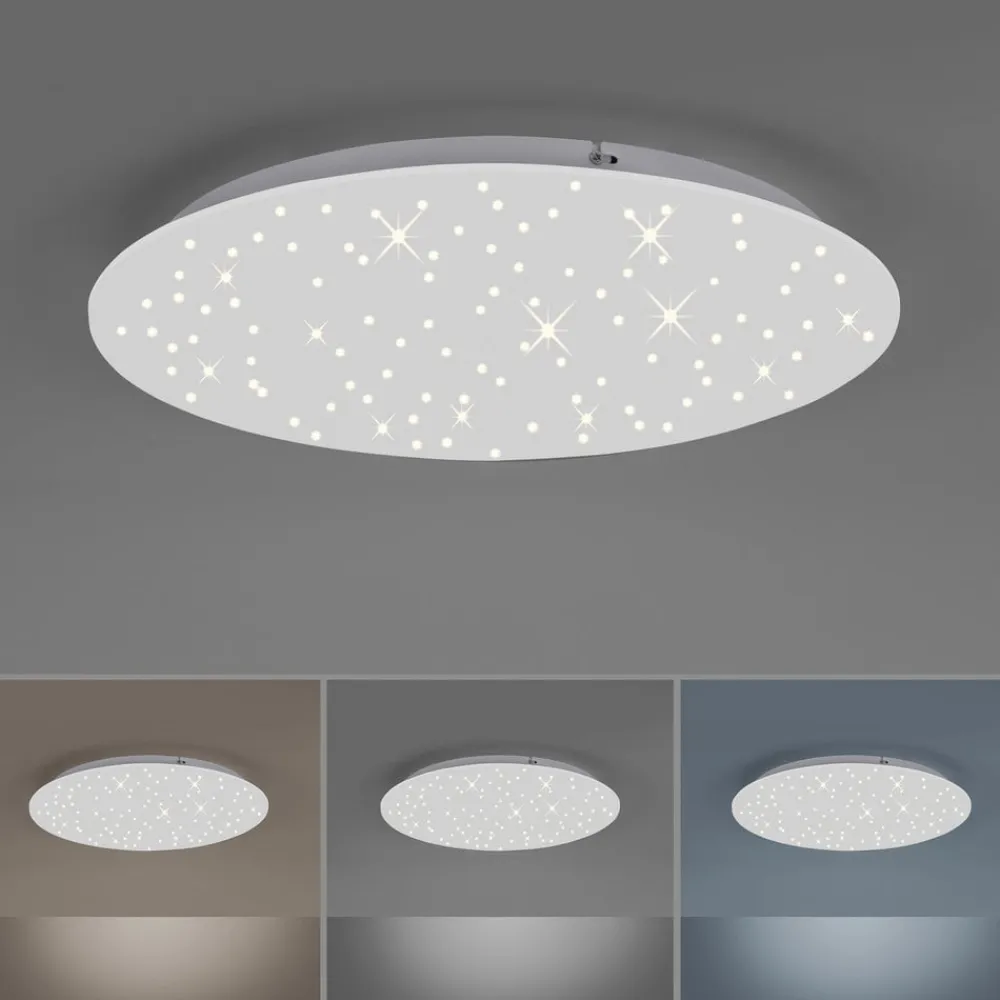 Sparkle hvid LED-loftlampe med fjernbetjening, CCT-funktion, dæmpbar Den runde LED-loftlampe Sparkle i hvid skaber indtryk af en stjernehimmel i loftet takket være de mange små lysåbninger. Sparkle er dæmpbar og udstyret med CCT-farvetemperaturændring fra 2.700 K til 5.000 K. Der medfølger en fjernbetjening (inkl. 2 x AAA-batterier) til dette formål. Særligt praktisk: omskiftning og skift mellem 2.700 K, 3.850 K, 5.000 K og natlampe kan også ske ved hjælp af en vægkontakt – dæmpbar – farveskift CCT – inklusive hukommelse og natlampe-funktion Unge og dynamiske værdier kendetegner JUST LIGHT-mærket. – tidligere kendt som Leuchten Direkt.