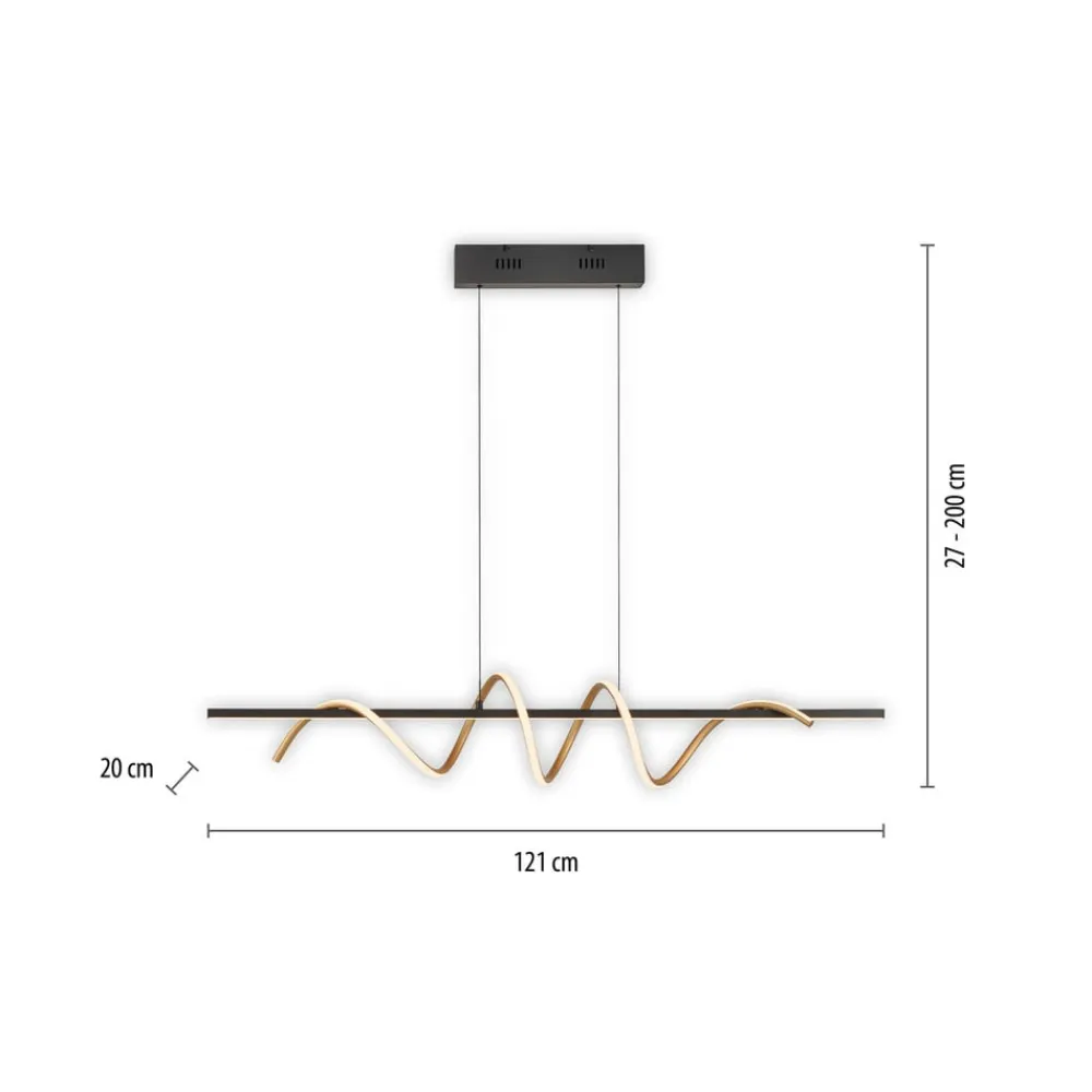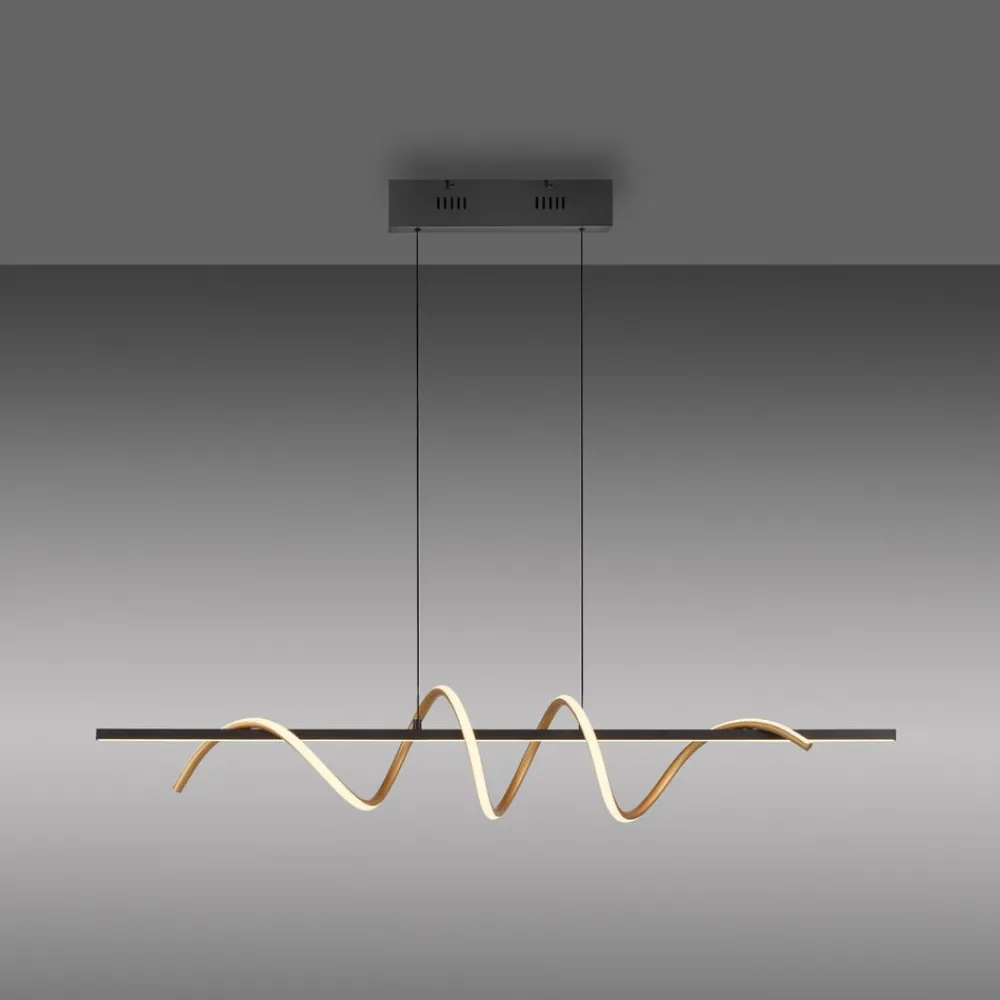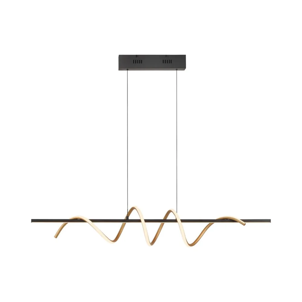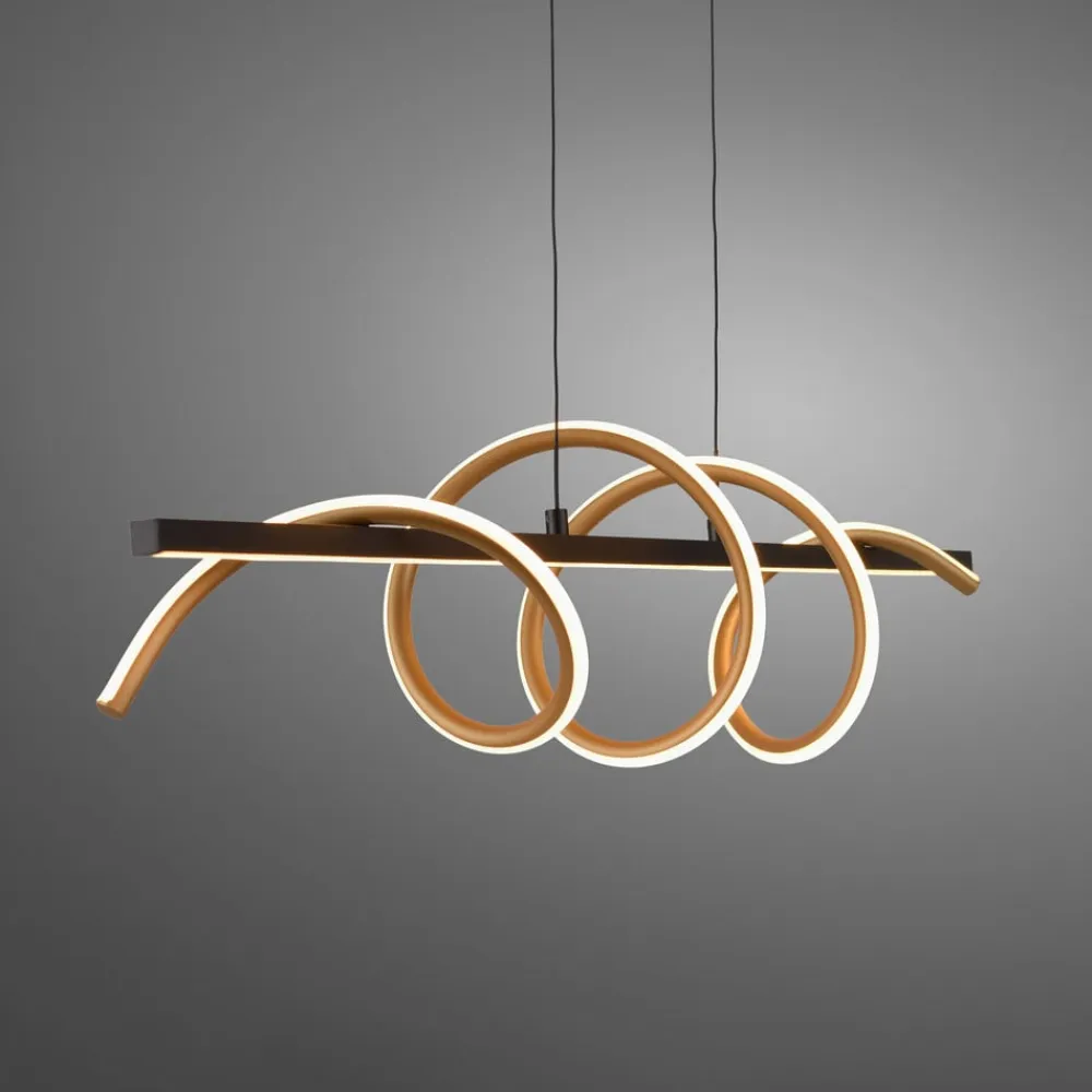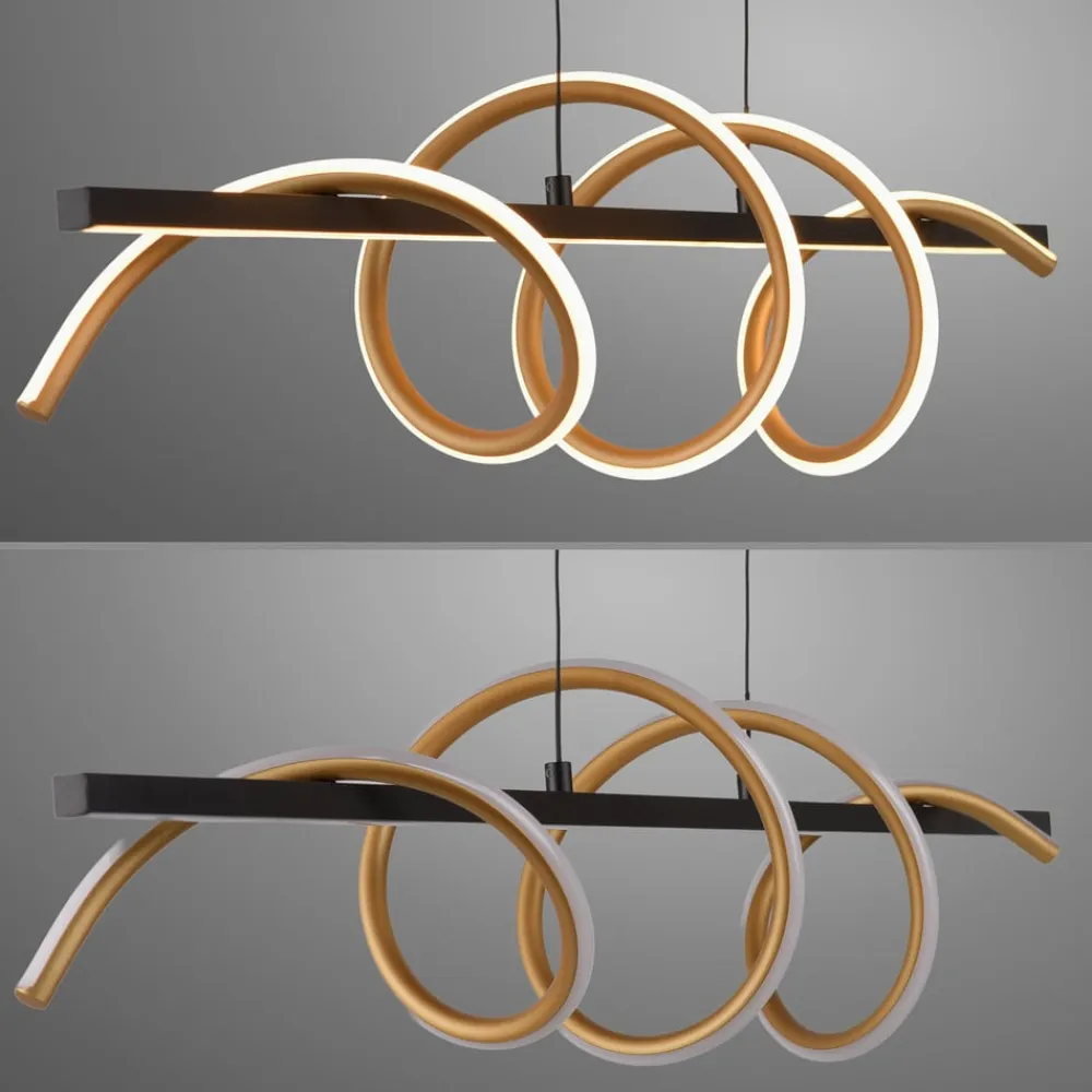 Emanda LED-pendel, sort og messingfarvet Emanda er en hængelampe i metal, som også ser meget dekorativ ud, når den er slukket, og som er særlig flot over et langt spisebord. Lampen består af en rektangulær baldakin, en lang sort metalstang, der er ophængt i den, og en messingfarvet metalspiral, der snor sig om den sorte stang. Både den lige stang og spiralen er udstyret med et satineret dæksel på den ene side, bag hvilket der er installeret varmhvide LED’er. De lyser homogent uden synlige lyspunkter og skaber et bånd eller en spiral af lys. Unge og dynamiske værdier kendetegner JUST LIGHT-mærket. – tidligere kendt som Leuchten Direkt